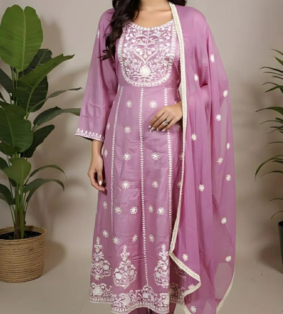Baby Pink Cotton Rayon Anarkali Suit with White Embroidery & Dupatta