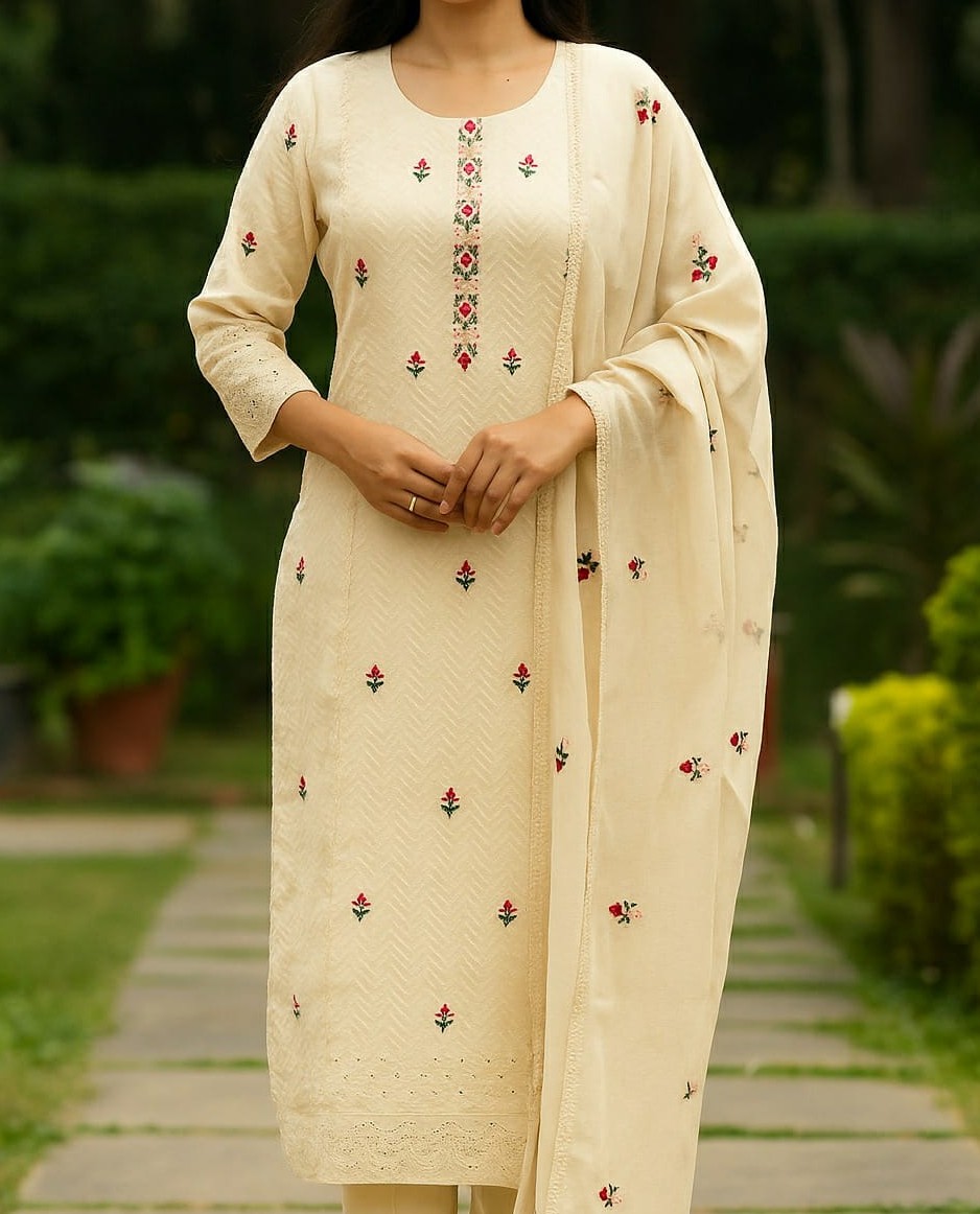 Cream Cotton Kurta Set with Delicate Floral Embroidery & Dupatta