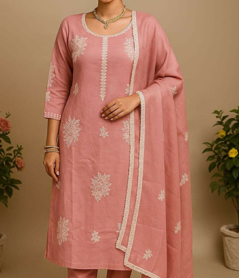 Dusty Pink Cotton Kurta Set with White Thread Embroidery & Dupatta
