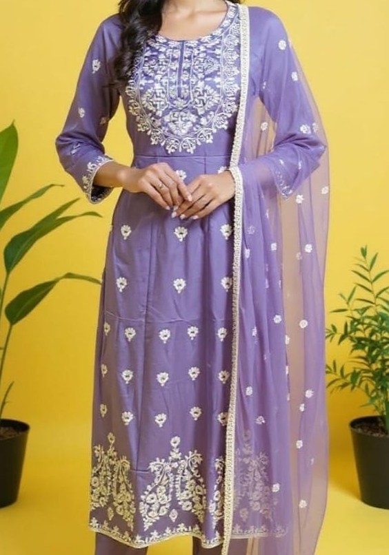 Lavender Cotton Rayon Anarkali Suit with White Embroidery & Dupatta