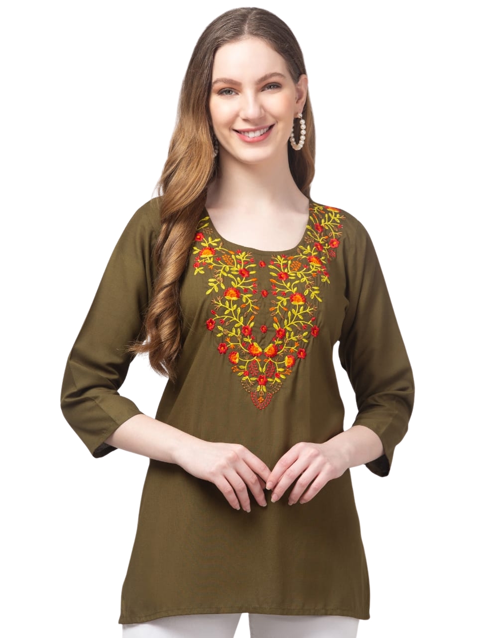 Olive Greaan Women’s Embroidered Floral Kurti | 3/4 Sleeve Rayon Ethnic Top for Casual Short Kurti