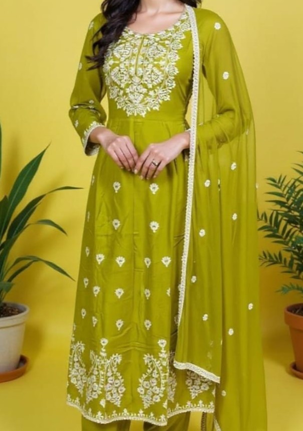 Olive Green Cotton Rayon Anarkali Suit with White Embroidery & Dupatta