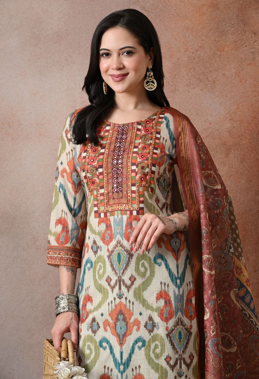 Step into effortless elegance with this beautifully crafted printed kurta pant dupatta set, designed to bring a perfect blend of tradition and modern style. Made from soft and breathable linen fabric, the kurta showcases intricate ikat-inspired ethnic motifs paired with a richly detailed yoke design that enhances its festive appeal.
