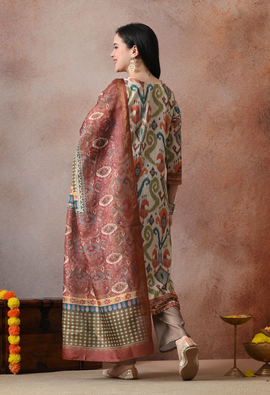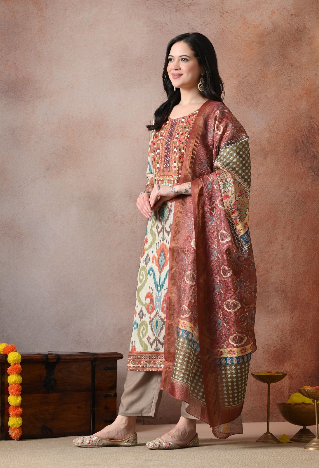 Women Digital Printed Linen Kurta Pant Dupatta Set | Ethnic Ikat Design Suit Set | Straight Kurti with Pant & Organza Dupatta | Festive Wear