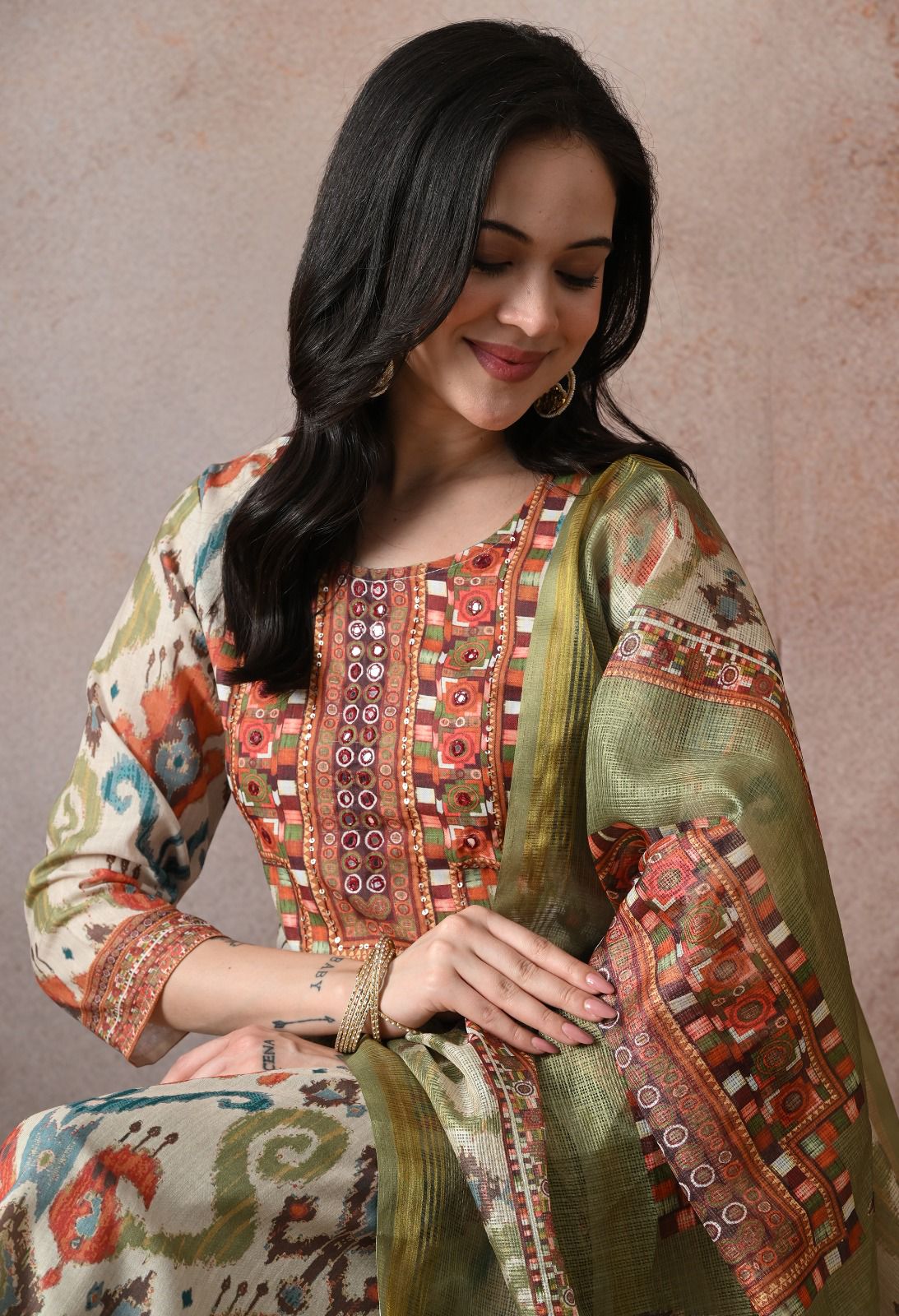 The kurta features intricate ethnic-inspired prints with detailed panel design on the yoke, giving it a rich and traditional appeal. Paired with comfortable solid pants and a lightweight printed dupatta, this set creates a complete festive-ready look.