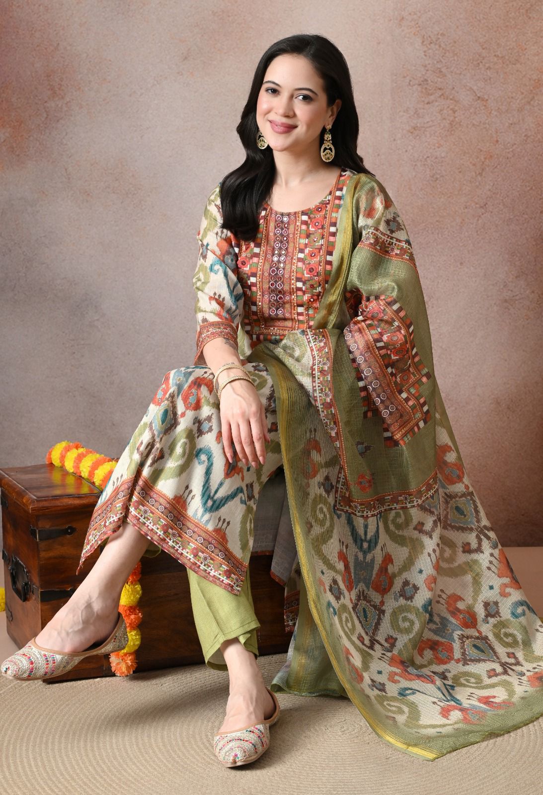 Women Digital Printed Linen Kurta Pant Dupatta Set | Ethnic Suit Set with Dupatta | Straight Kurti with Pant | Festive & Casual Wear