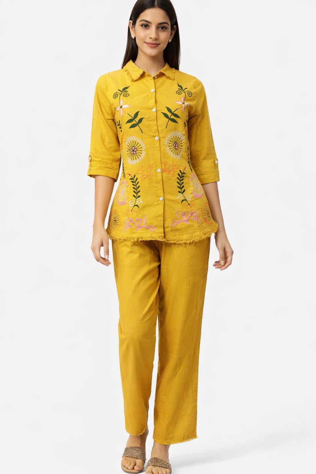 Women Mustard Yellow Cotton Kurta Pant Set | Floral Embroidered Straight Kurta with Pants | Casual & Ethnic Wear