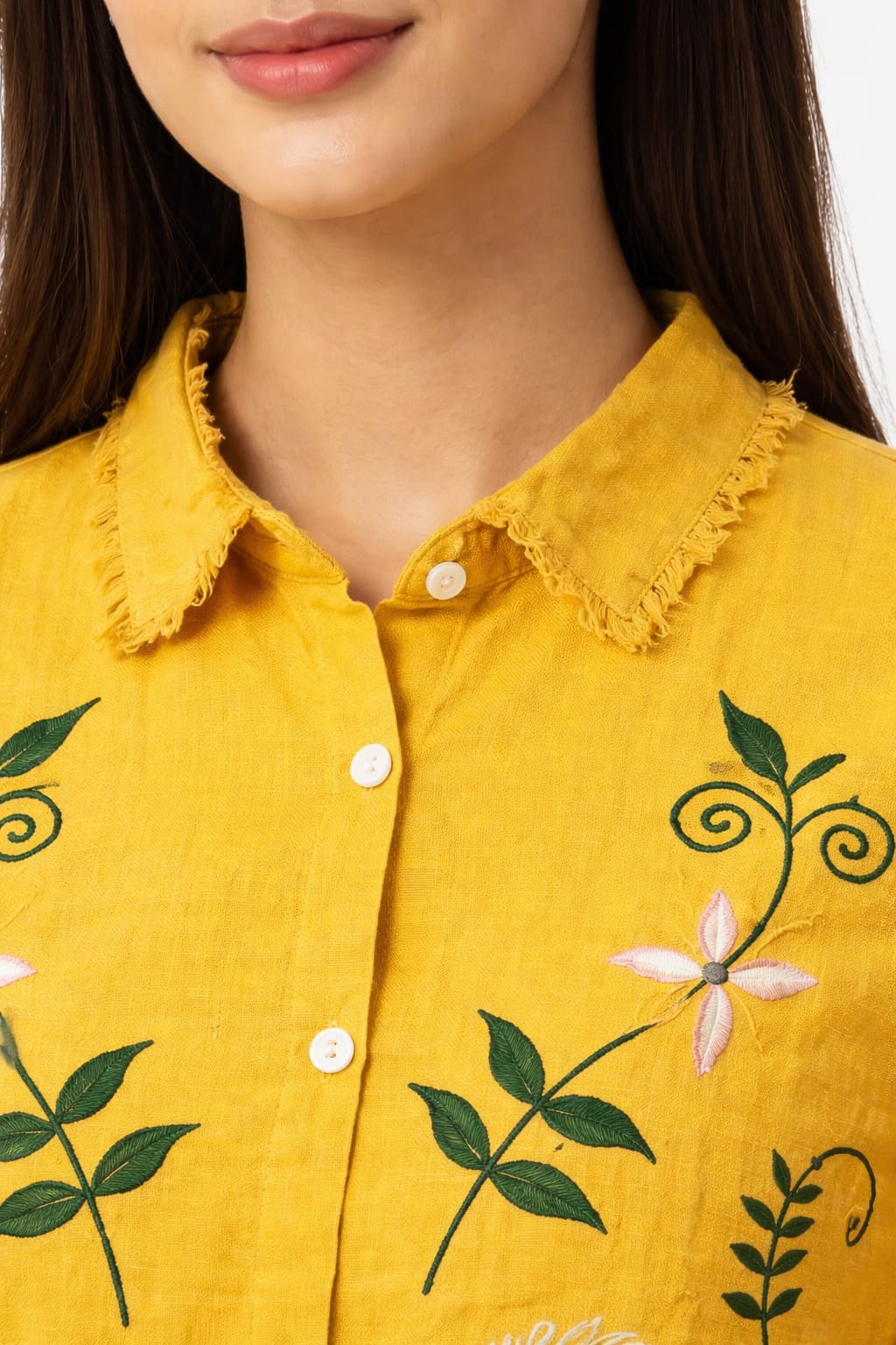 The kurta features a stylish shirt collar with button-down front, giving it a modern Indo-western look. Beautiful floral embroidery on the front enhances its overall appeal, while the subtle frayed detailing on the collar and hem adds a trendy touch.