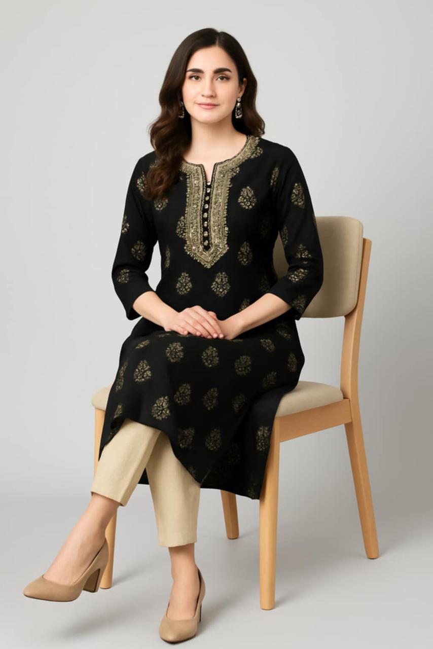 Women’s Black Rayon Printed Kurti | Elegant Gold Print Straight Kurti with Embroidered Neck | Daily & Festive Wear