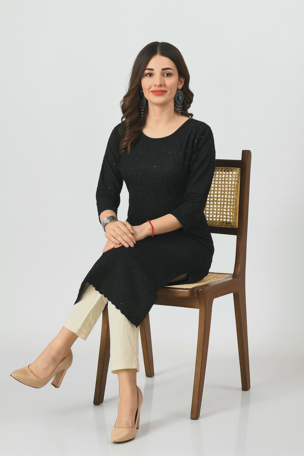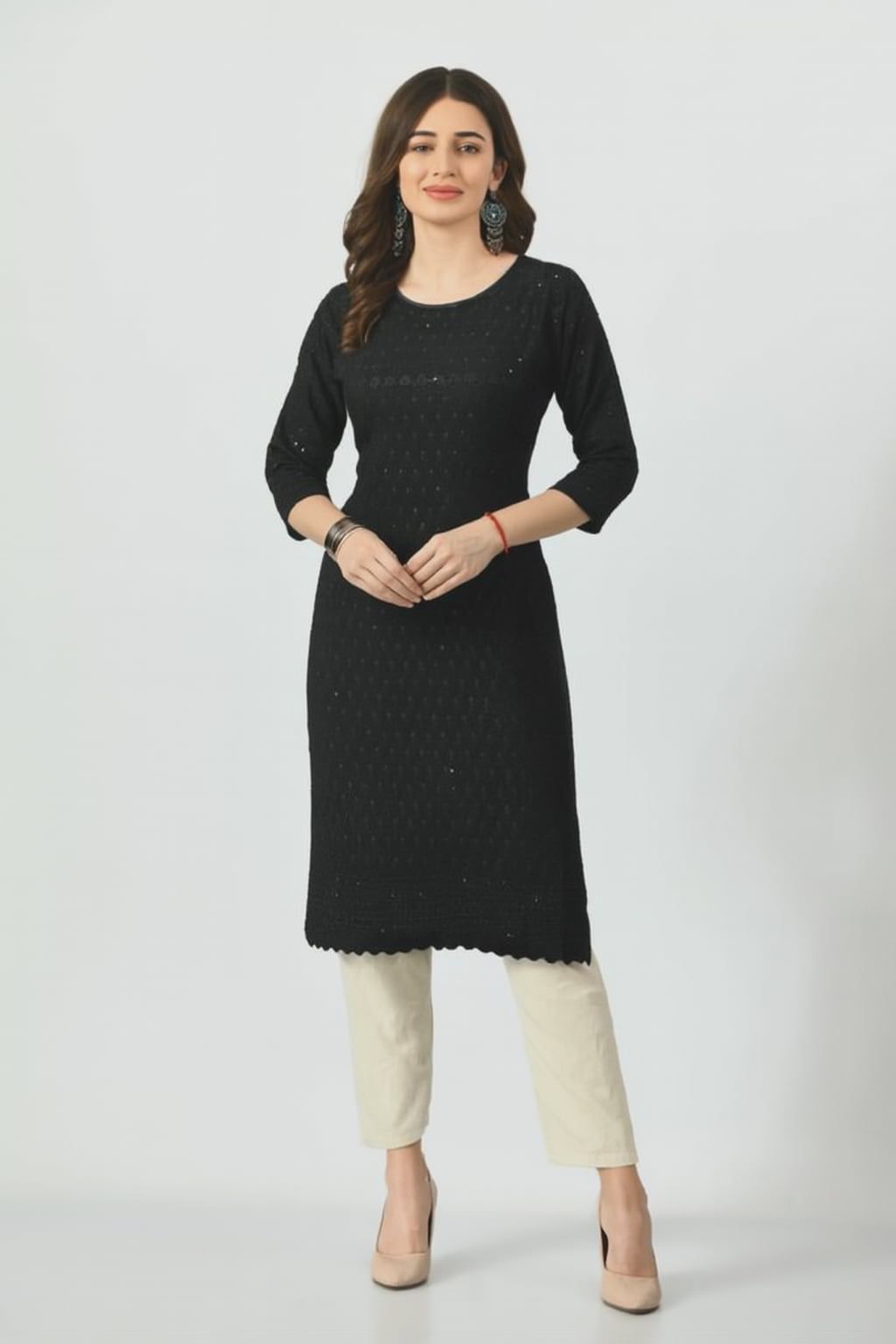 Women’s Black Textured Straight Kurti | Soft Rayon Blend Long Kurti with 3/4 Sleeves | Daily & Office Wear