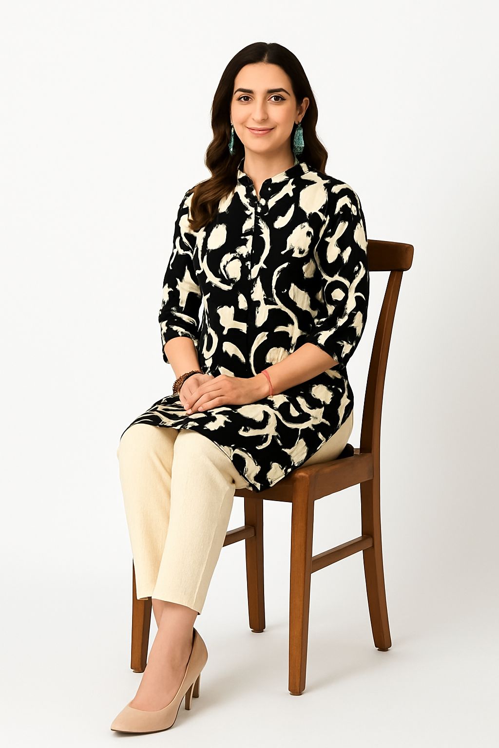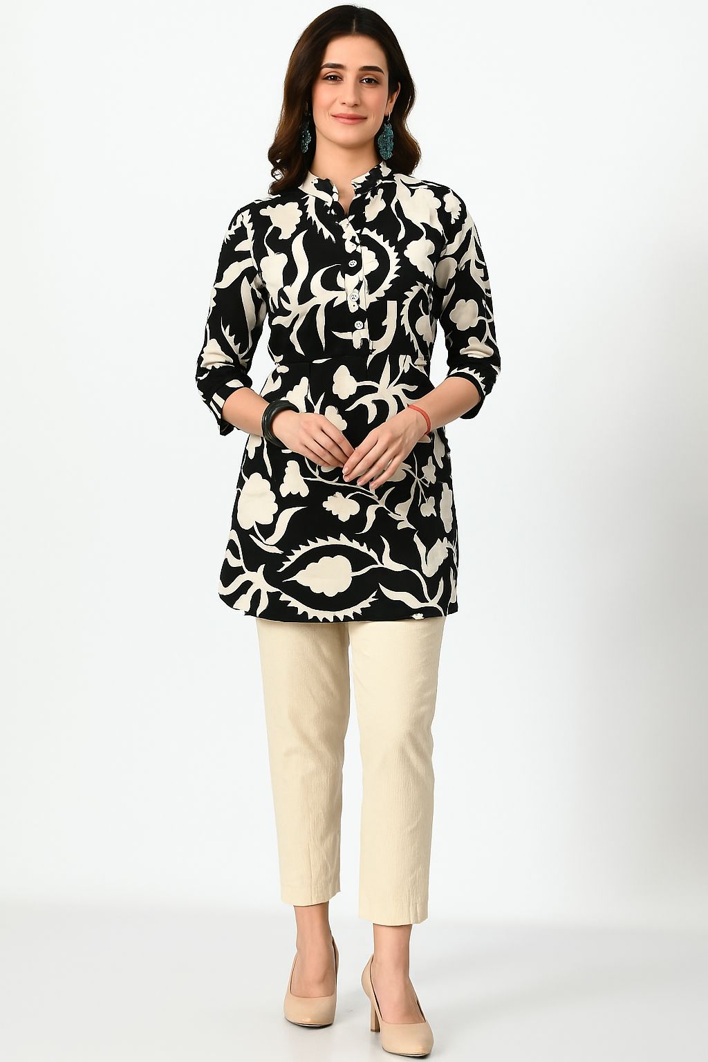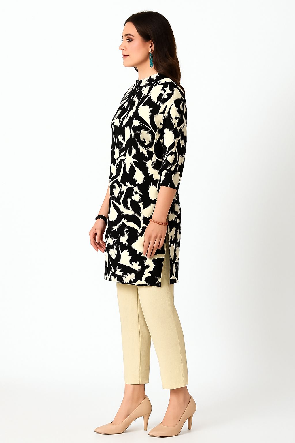 Elevate your everyday look with this black and white floral printed straight kurti, featuring a mandarin collar, button placket, and three-quarter sleeves for effortless style and comfort.