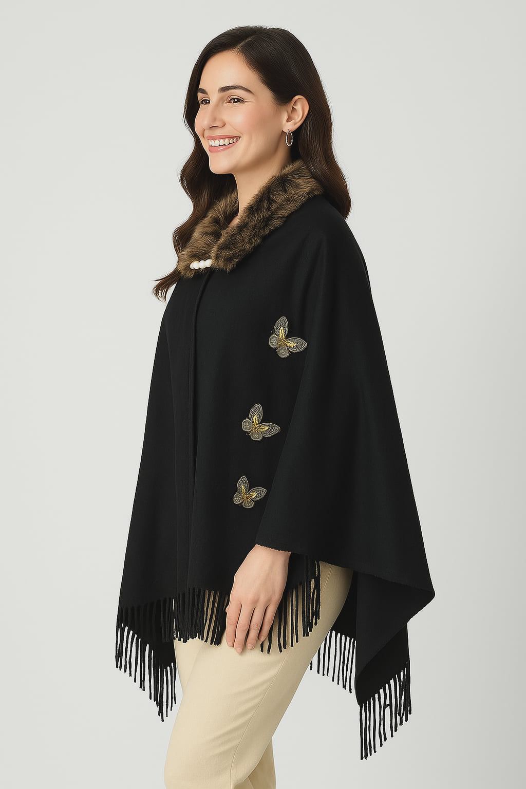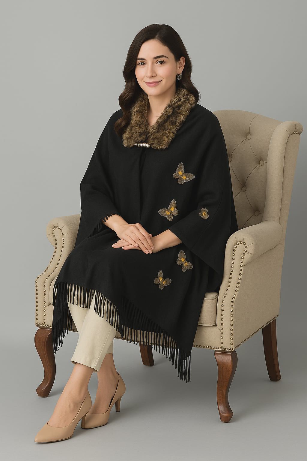 Women’s Black Woolen Cape Shawl with Faux Fur Collar | Butterfly Embroidered Winter Poncho