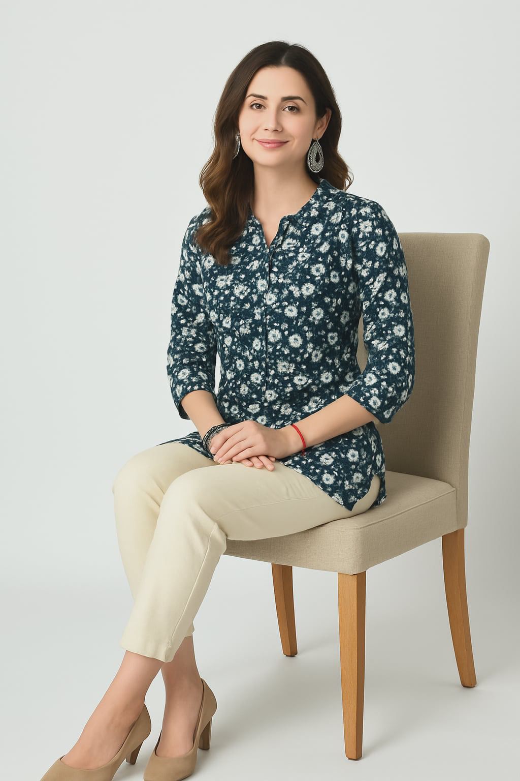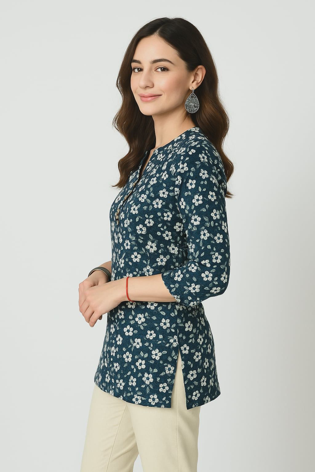 Women’s Blue Floral Printed Rayon Short Kurti | Daily Wear Tunic with 3/4 Sleeves & Stylish Neck