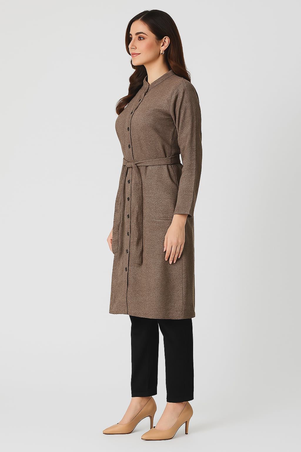Women’s Brown Woolen Long Coat Kurti | Winter Warm Button-Down Kurti with Belt & Full Sleeves