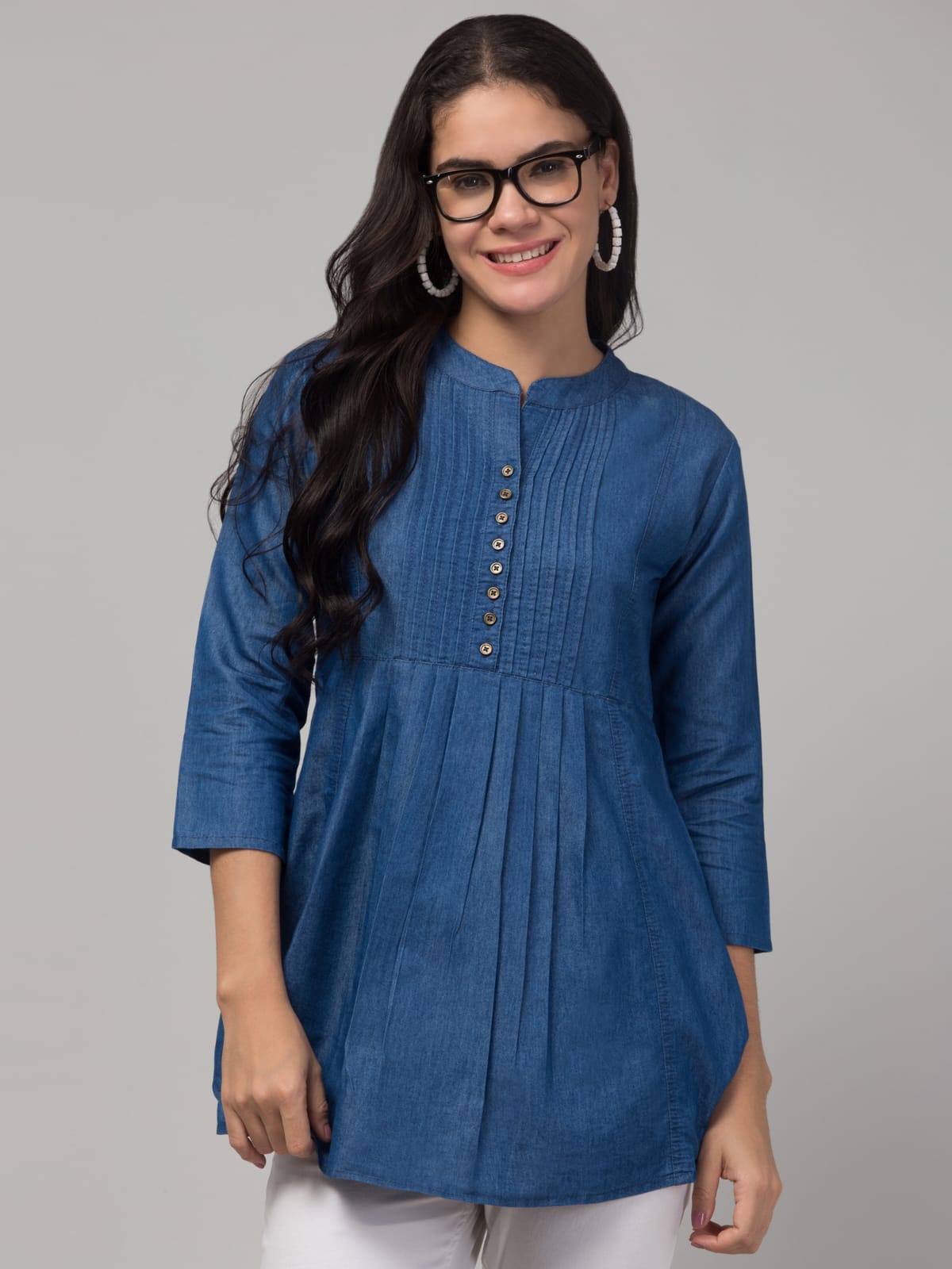 Women’s Denim Blue Pleated Tunic Top | Mandarin Collar | Button Placket | 3/4 Sleeves | Casual & Office Wear