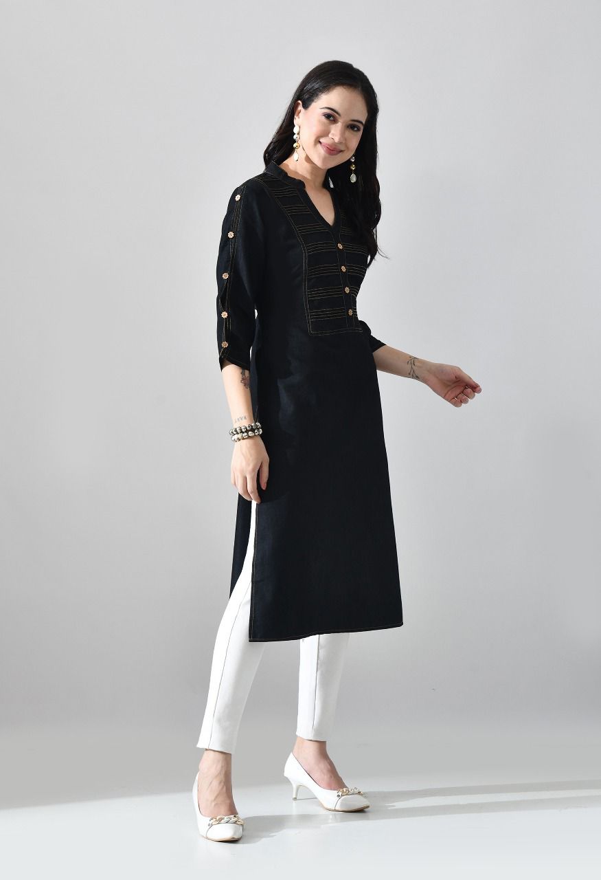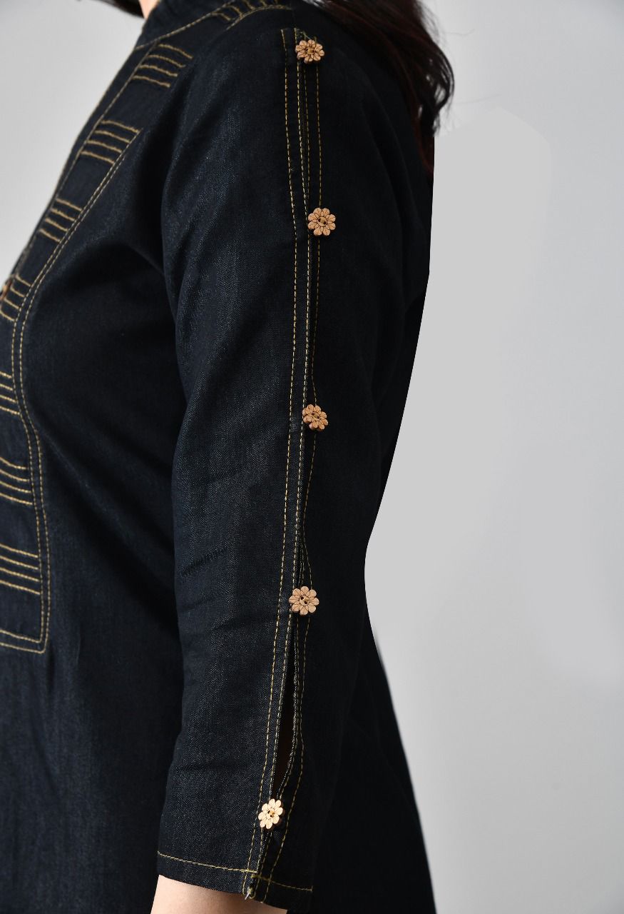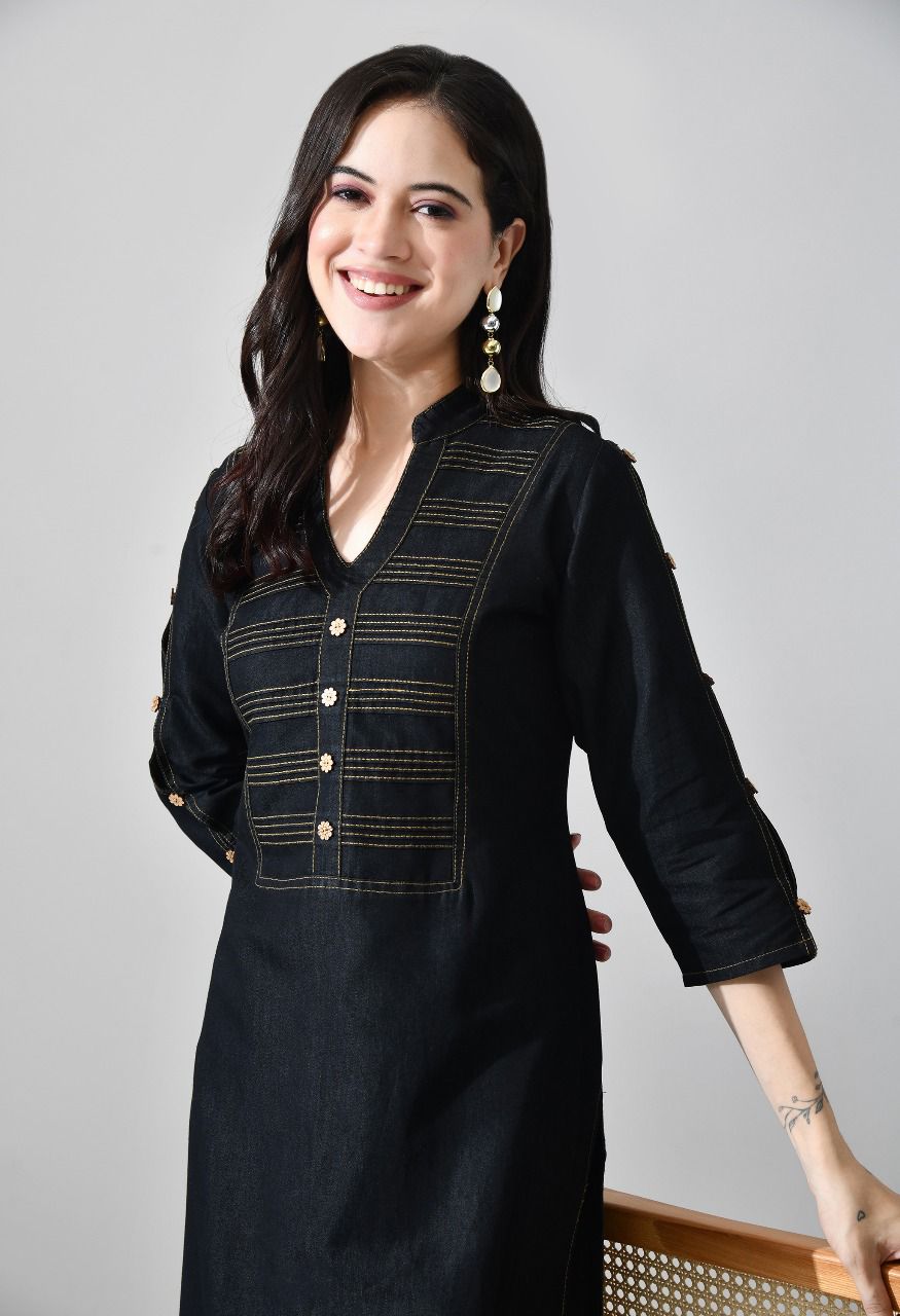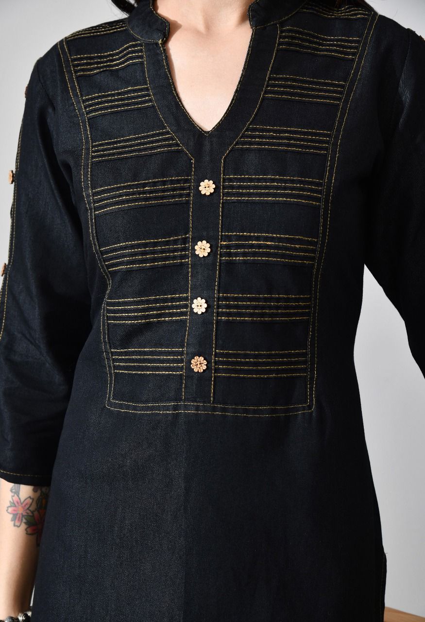 Elegant black denim kurti with contrast white thread embroidery on the yoke