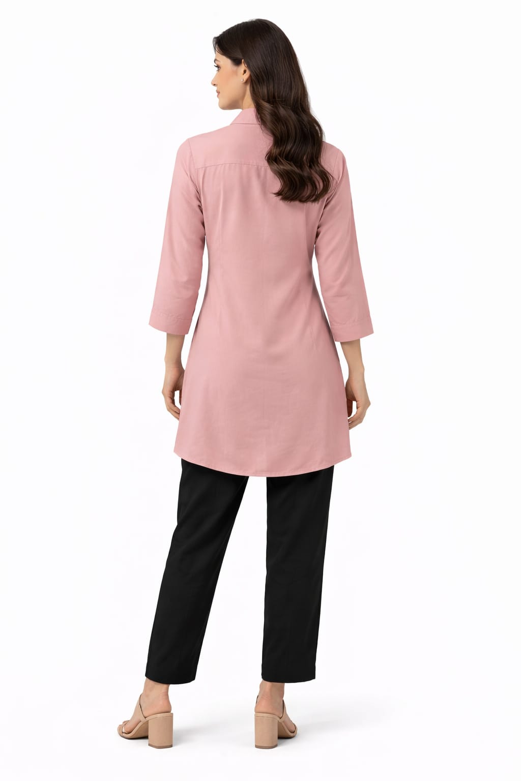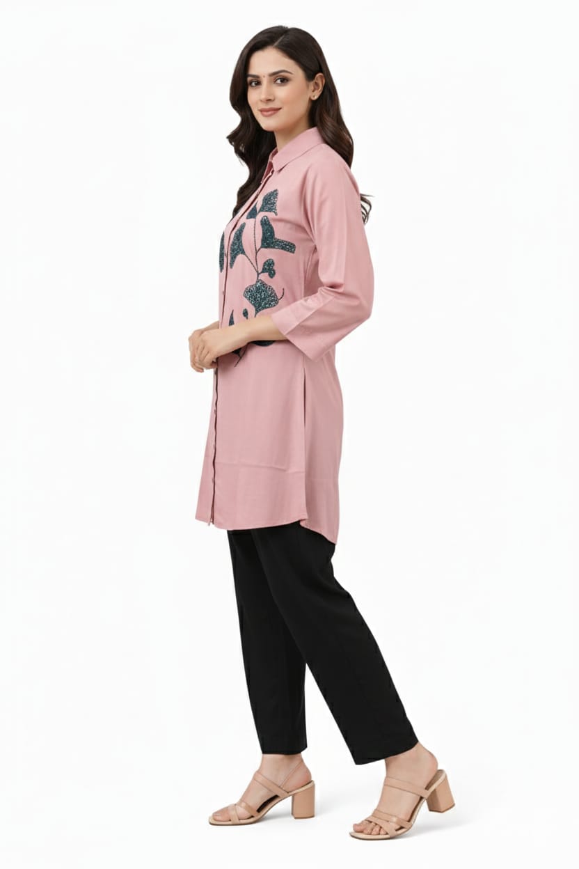 Women’s Dusty Pink Printed Shirt Style Kurti | 3/4 Sleeves | Button-Down Collar Kurta | Casual & Office Wear Tunic Top
