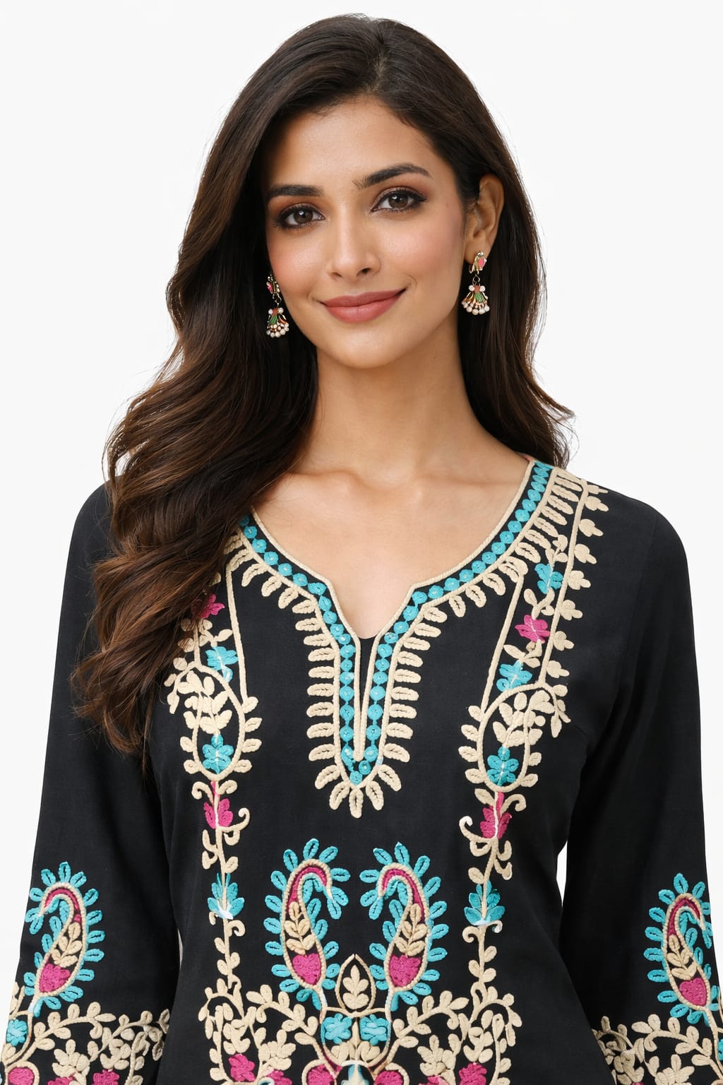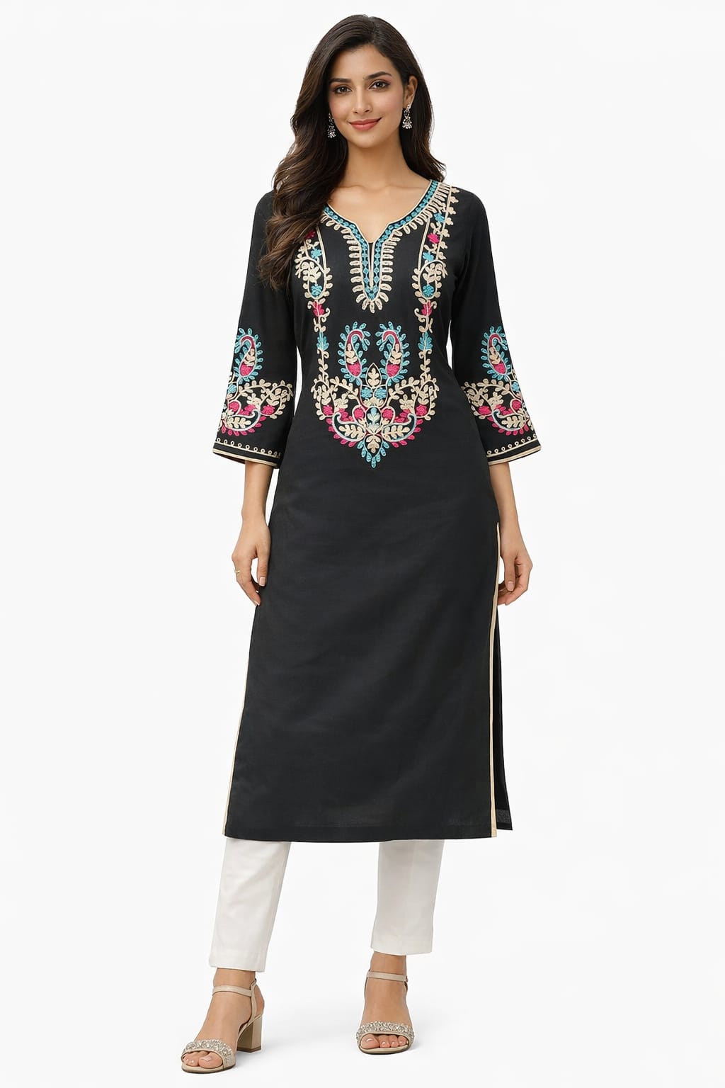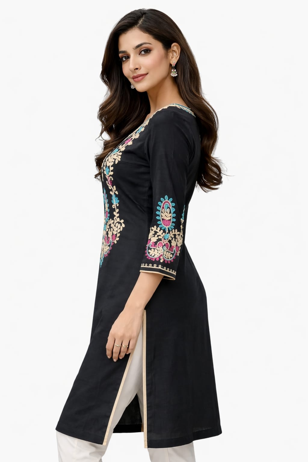 Women’s Elegant Black Embroidered Kurti | Cotton Straight Fit Kurta | Festive & Casual Wear