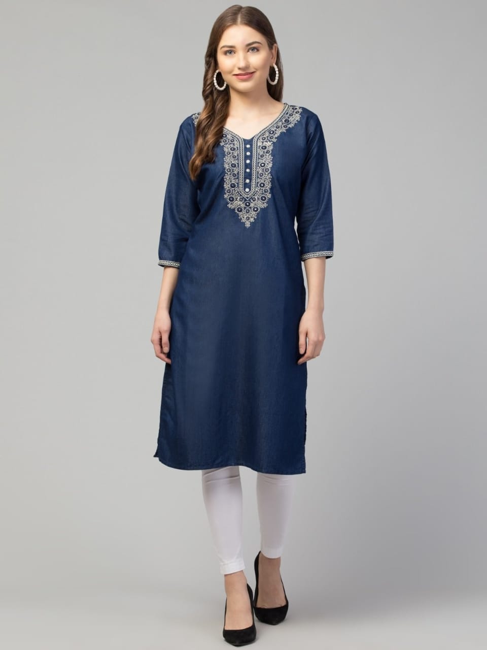 Women’s Embroidered Denim Blue Straight Kurti | V-Neck | Thread Work Yoke | 3/4 Sleeves | Casual & Office Wear