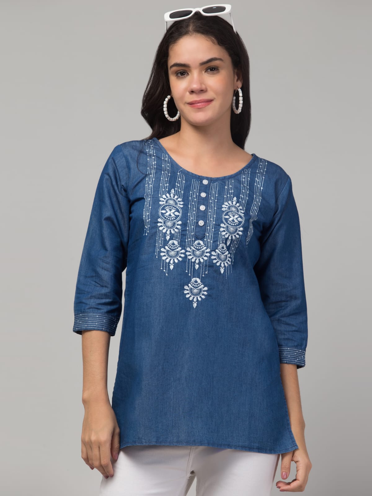 Women’s Embroidered Denim Blue Tunic Top | Round Neck | Ethnic Thread Work Yoke | 3/4 Sleeves | Casual & Office Wear