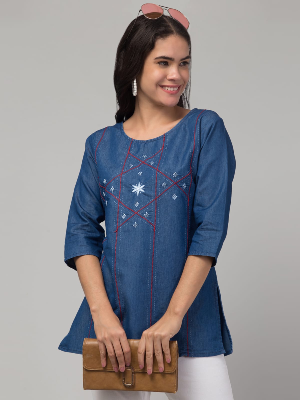 Women’s Embroidered Denim Blue Tunic Top | Round Neck | Geometric Thread Work | 3/4 Sleeves | Casual & Office Wear