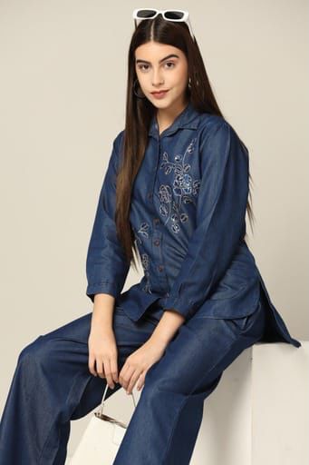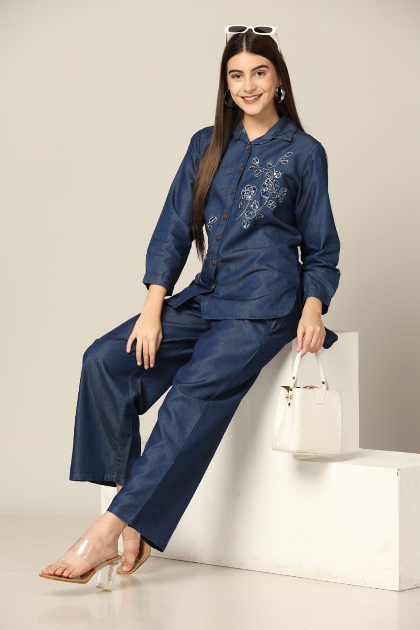 Elegant denim co-ord set featuring a button-down embroidered shirt and matching pants