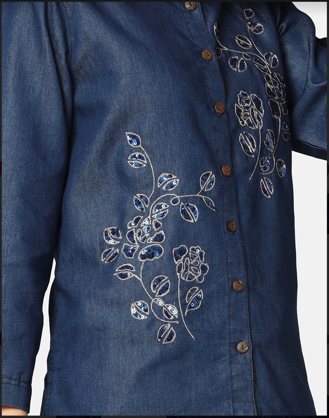 Women’s Embroidered Denim Co-ord Set | 3/4 Sleeves,Shirt Collar Neck |Pant with Half Elastic with Draw Strings