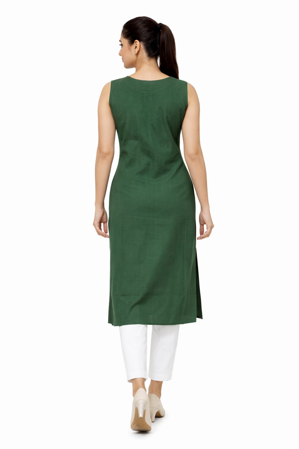 Women’s Green Sleeveless Straight Kurti | Embroidered Round Neck Ethnic Kurta | Calf Length Side Slit Casual & Office Wear