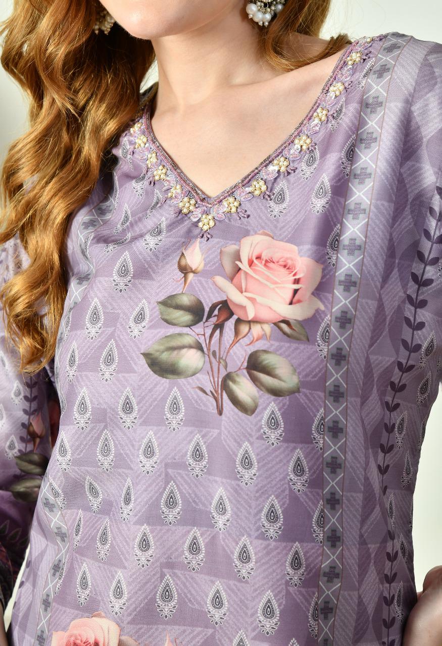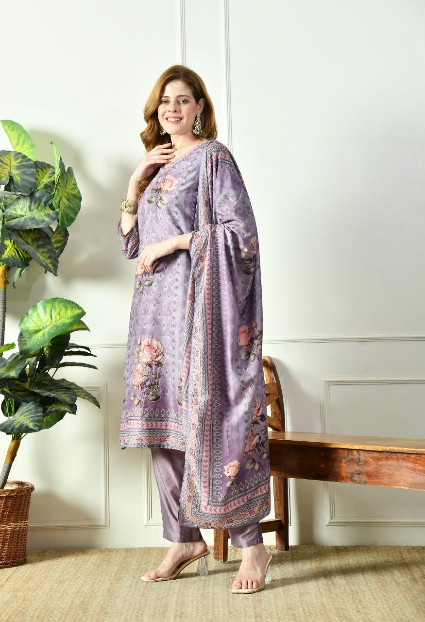 Women’s Lavender Floral Printed Straight Kurta with Pant & Dupatta Set Maslin Fabric
