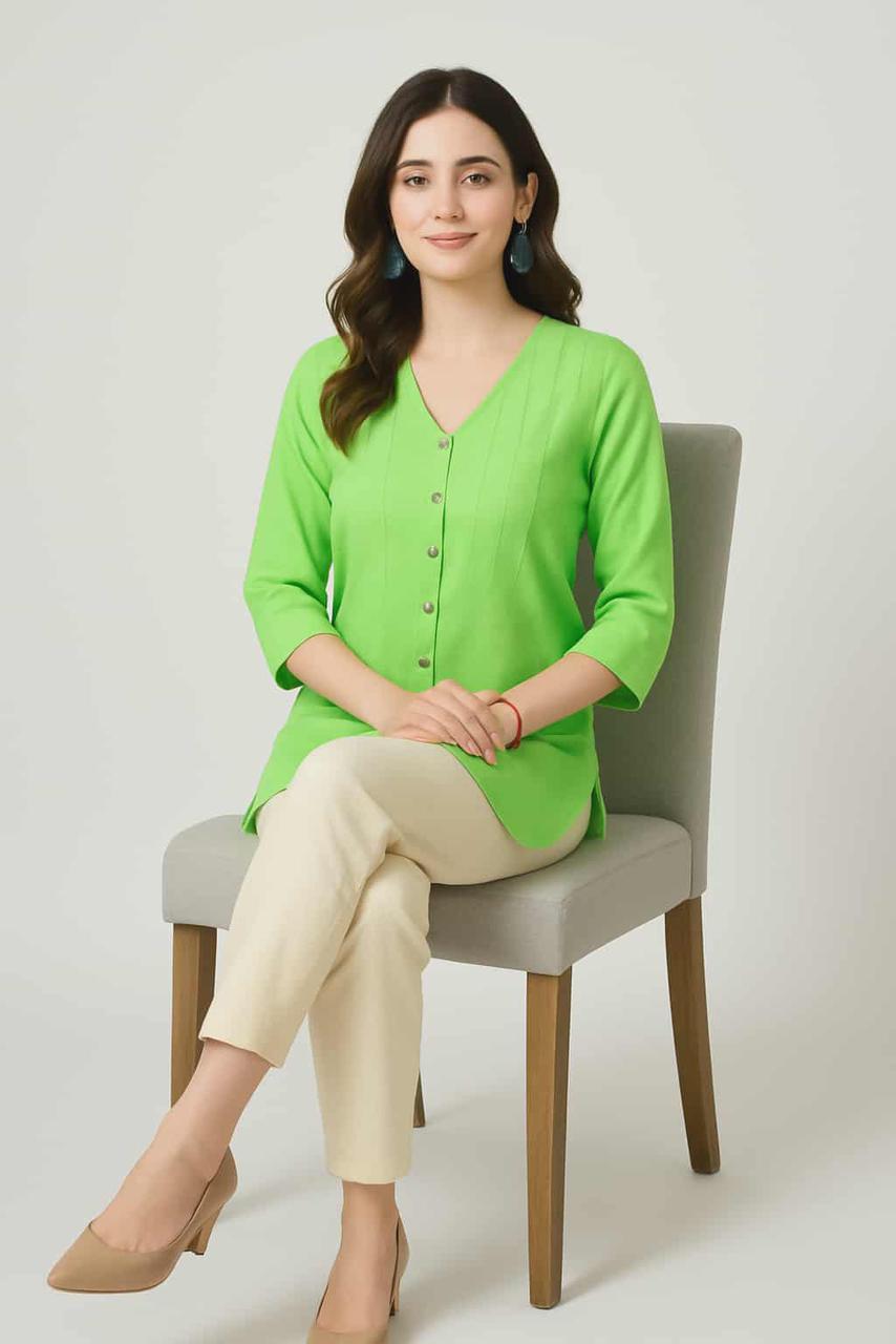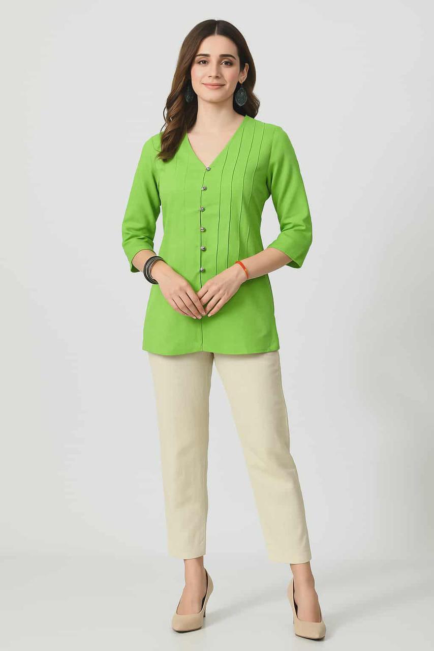 Women’s Light Green V-Neck Rayon Button Tunic | Elegant Straight-Fit Long Top with 3/4 Sleeves