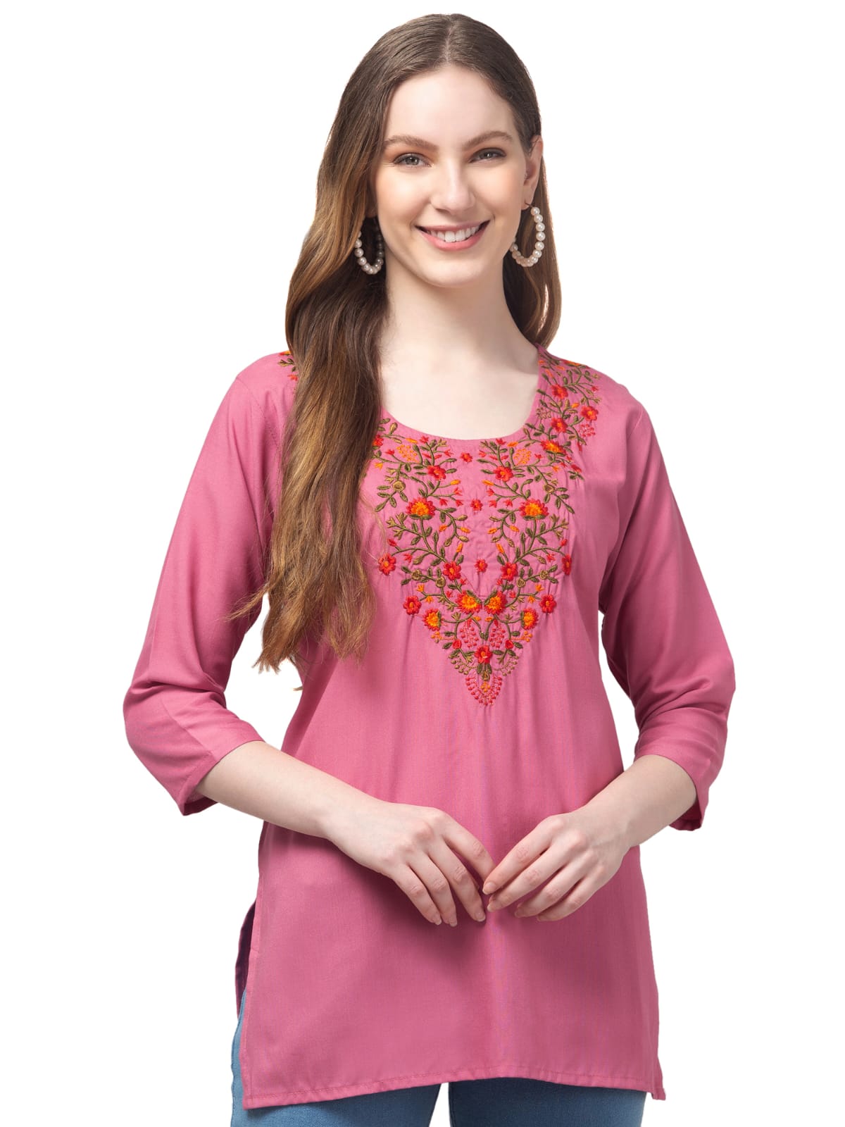 Rose Pink Women’s Embroidered Floral Kurti | 3/4 Sleeve Rayon Ethnic Top for Casual Short Kurti