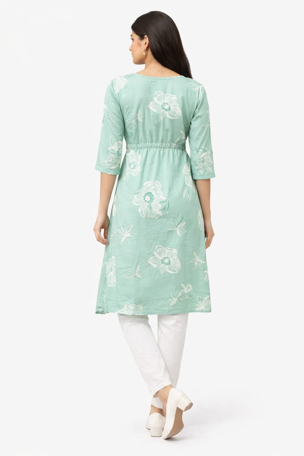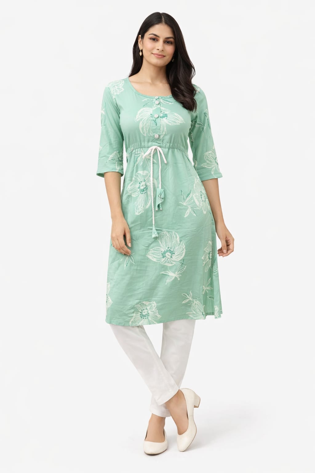 Women’s Mint Green Floral Print Rayon Kurti with Drawstring Waist | 3/4 Sleeves | Round Neck | Calf Length Casual & Office Wear