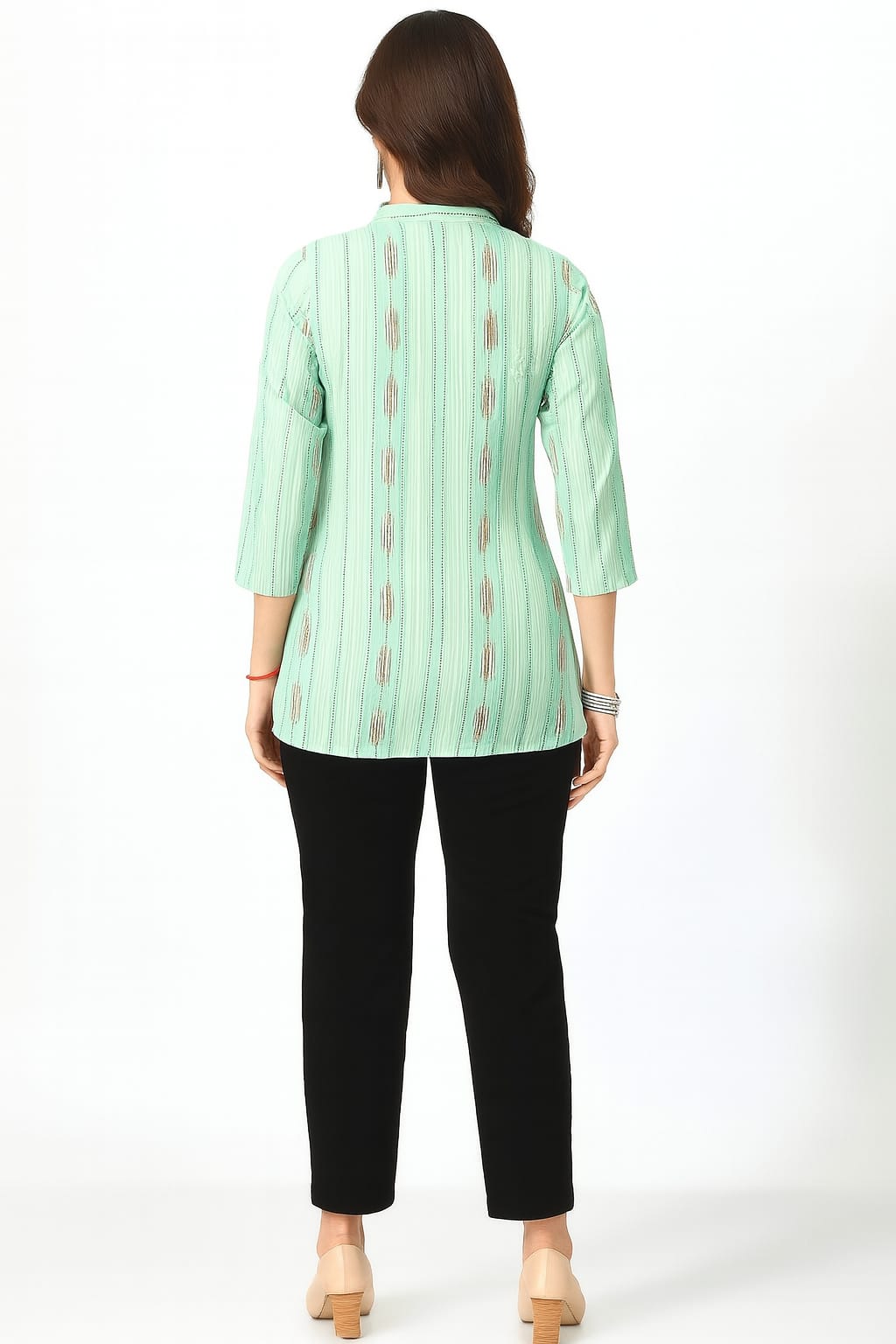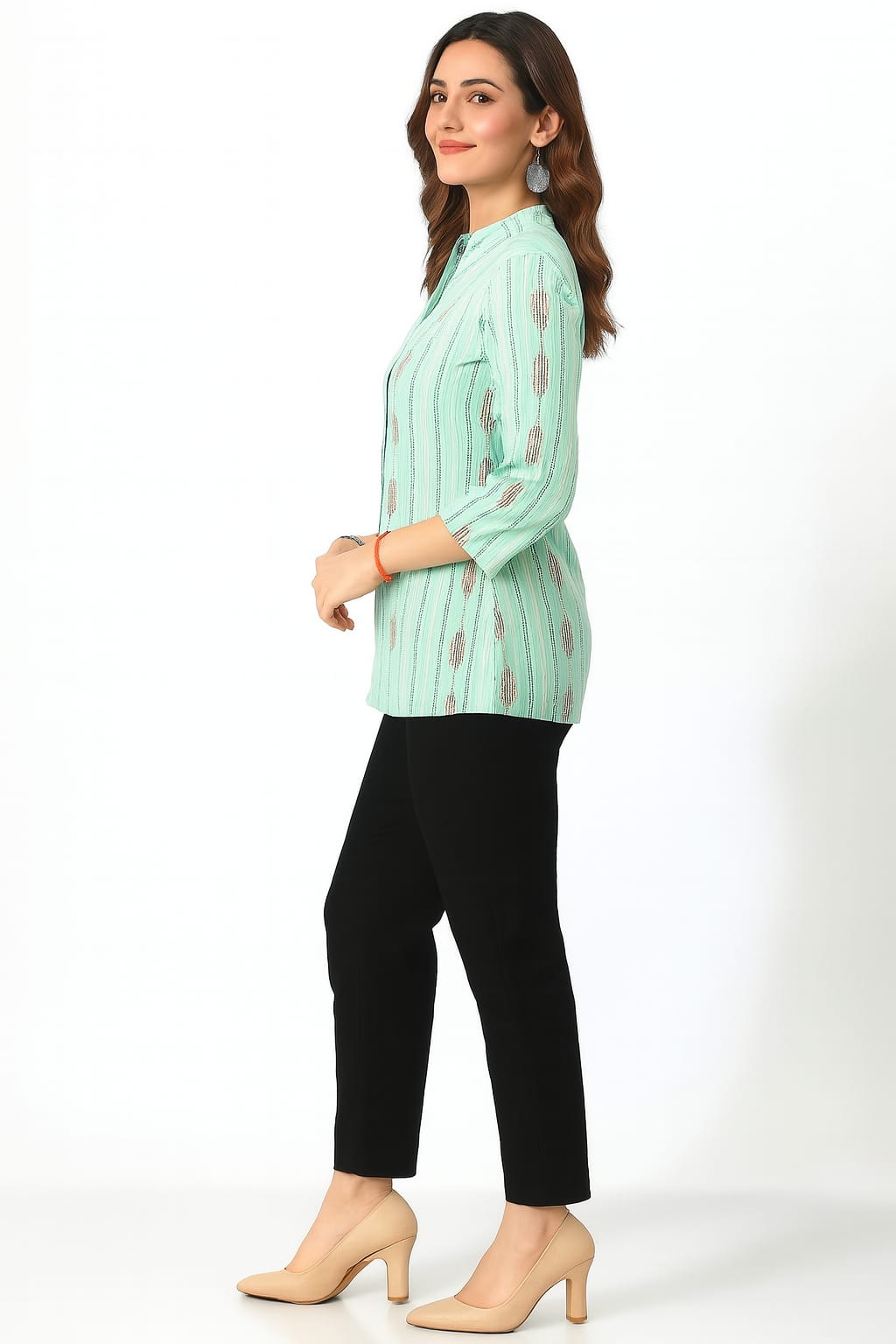 Women’s Mint Green Printed Rayon Shirt | 3/4 Sleeve Button-Down Top | Ethnic Casual & Office Wear Kurti Style Shirt