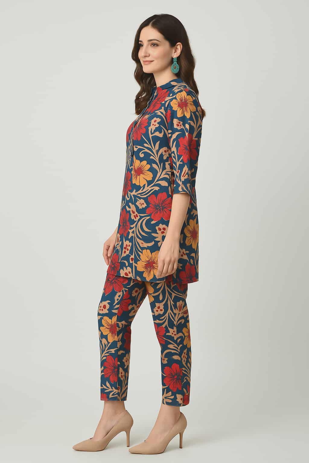 Women’s Multicolor Floral Printed Cotton Co-ord Set | Straight Kurta with Matching Pants | 3/4 Sleeve Casual & Festive Wear Set