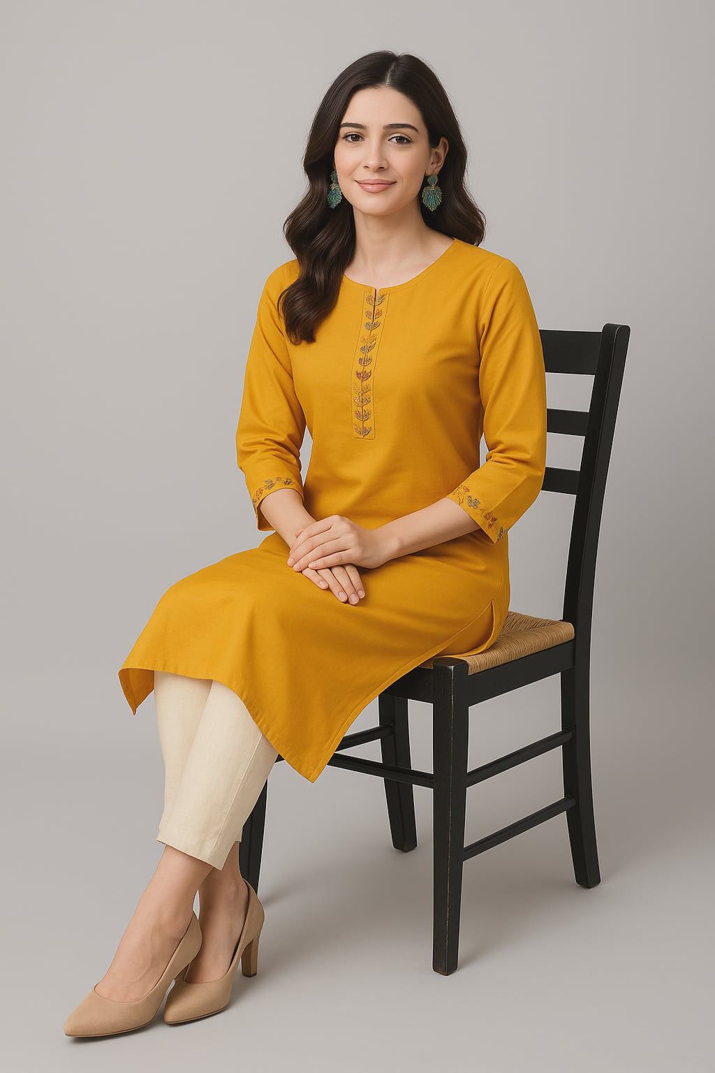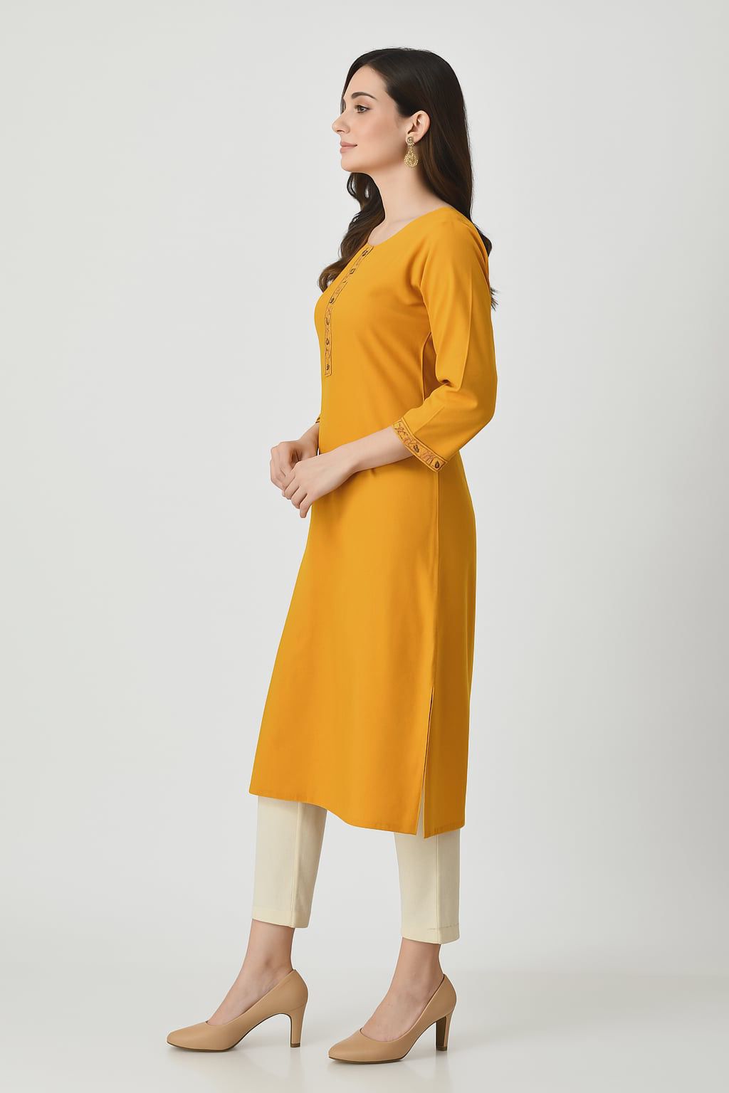 Women’s Mustard Rayon Embroidered Straight Kurti | Elegant Floral Work Kurti with 3/4 Sleeves | Daily & Office Wear