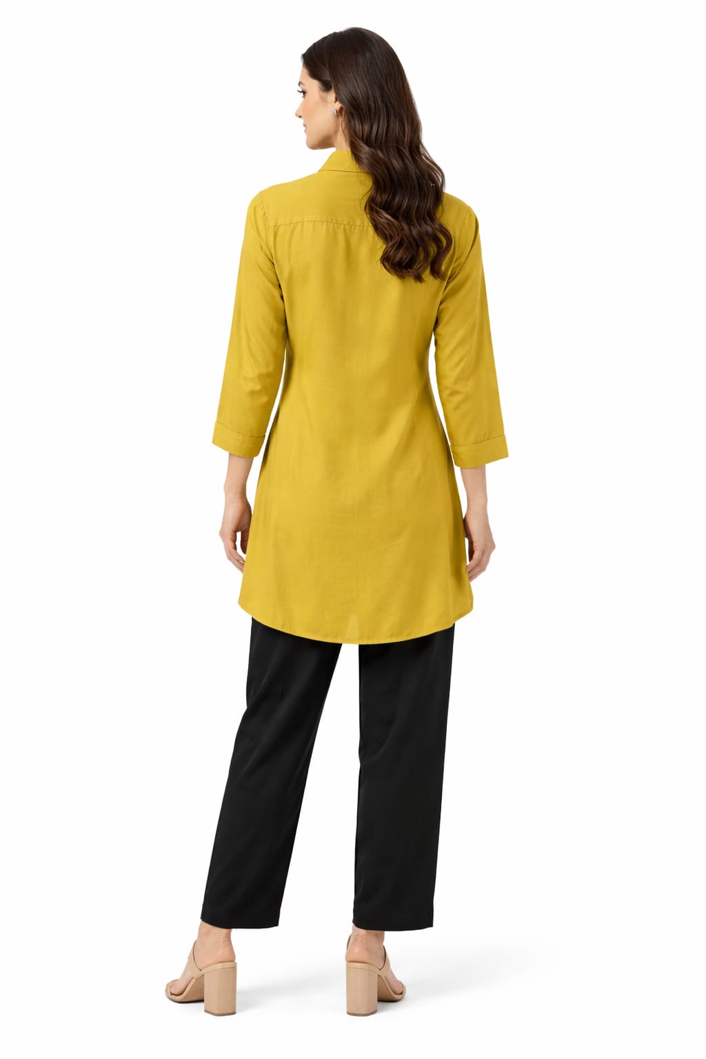 Women’s Mustard Yellow Printed Shirt Style Kurti | 3/4 Sleeves | Button-Down Collar Kurta | Casual & Office Wear Top
