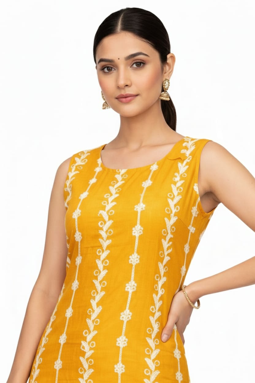 Women’s Mustard Yellow Sleeveless Straight Kurti | Vertical Printed Ethnic Kurta | Round Neck Calf Length Casual & Office Wear