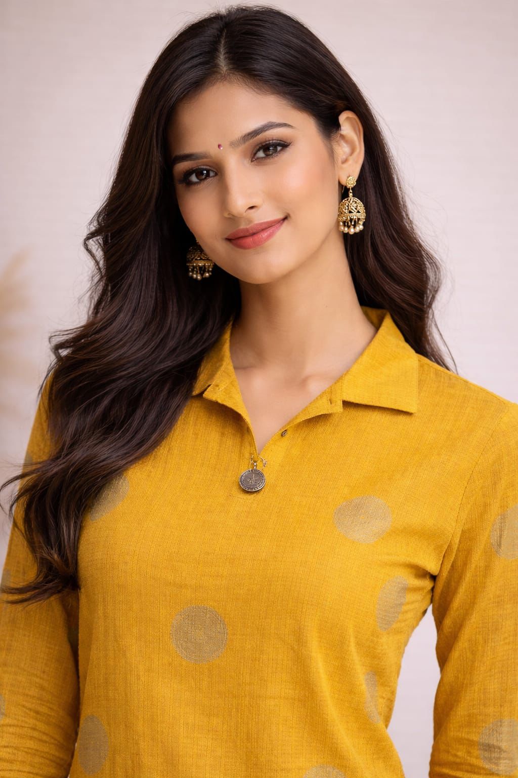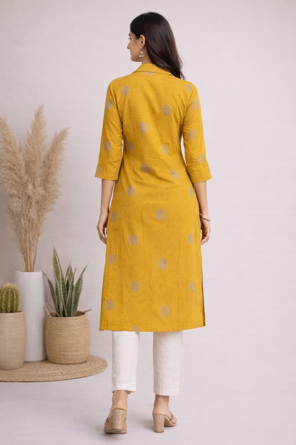 Women’s Mustard Yellow Straight Kurti | Polka Dot Print 3/4 Sleeve Ethnic Kurta | Collar Neck Calf Length Casual & Office Wear