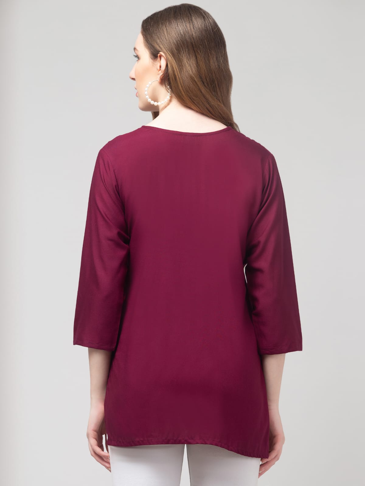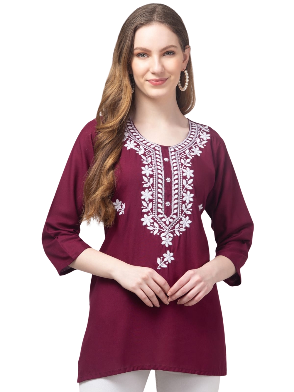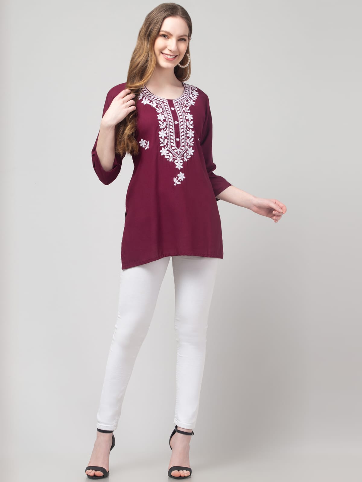 Women’s Rayon Embroidered Kurti Top | Wine 3/4 Sleeve Tunic with White Floral Work | Casual & Office Wear