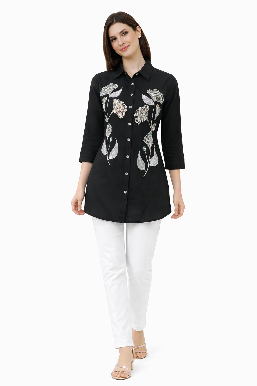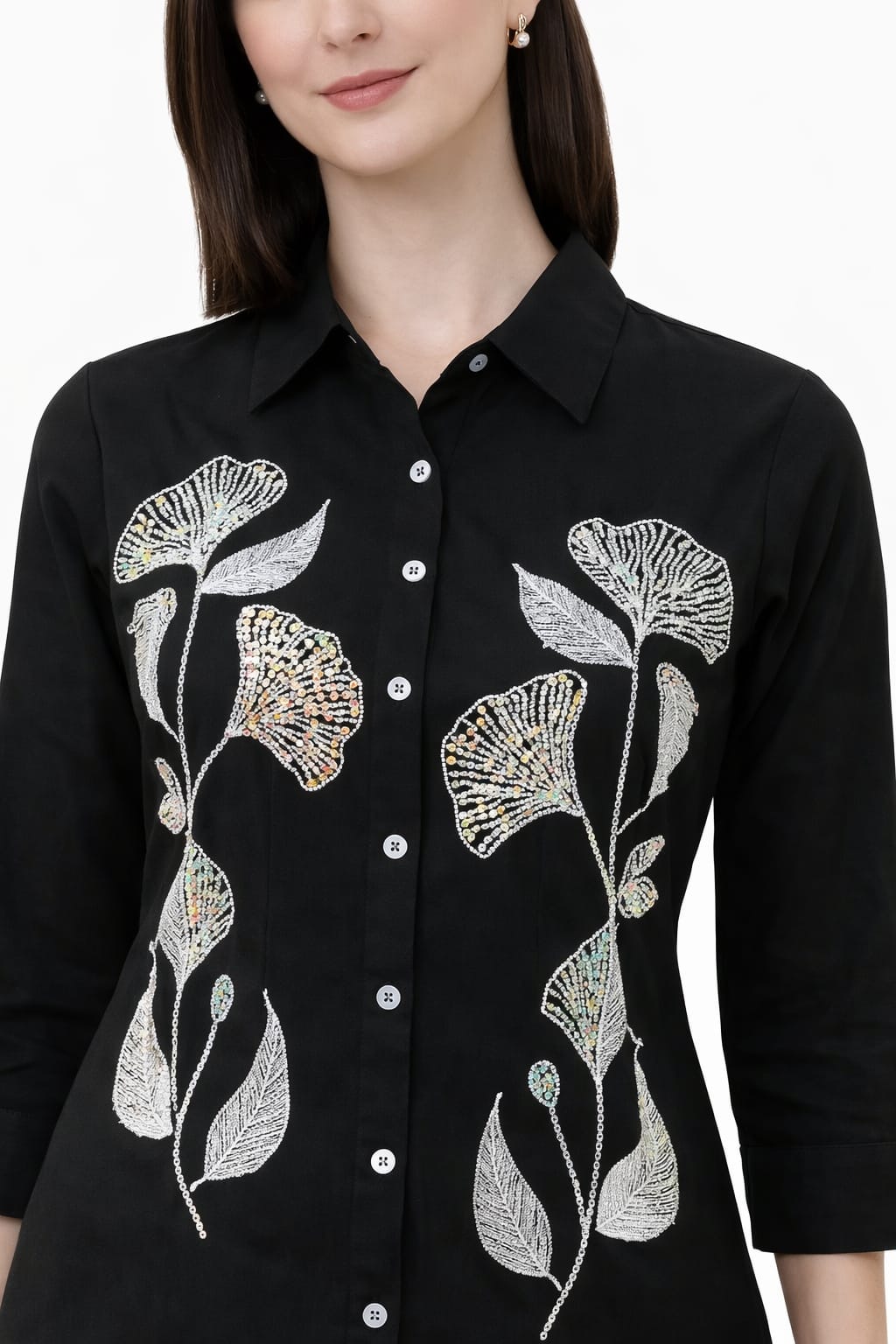 Women’s Rayon Embroidered Shirt Style Kurti | Floral Thread Work Button-Down Tunic | 3/4 Sleeve Straight Casual & Office Wear Kurta