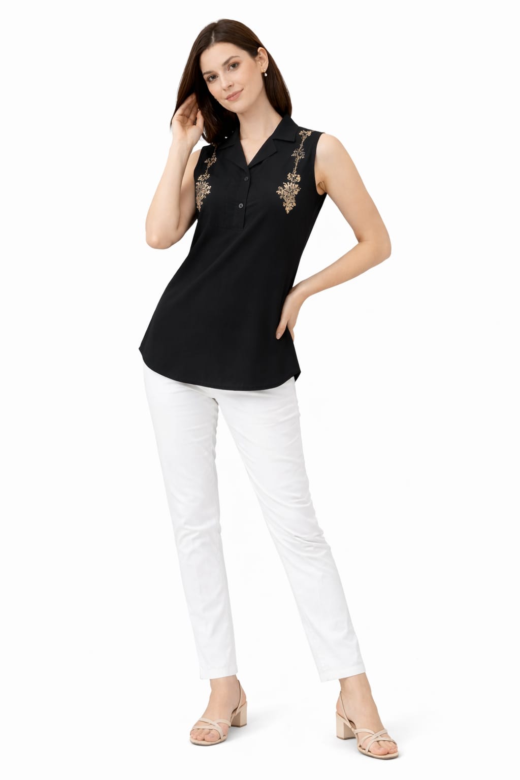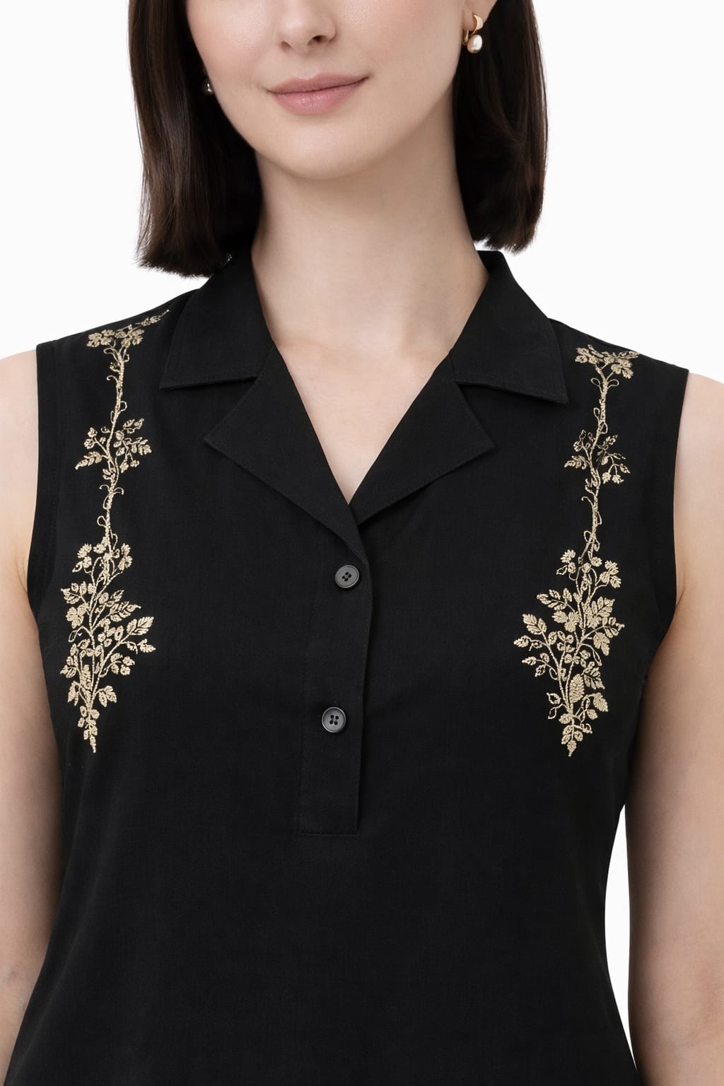 Women’s Rayon Embroidered Sleeveless Shirt Style Top | Floral Thread Work Collar Neck Tunic | Casual & Office Wear Kurti Top