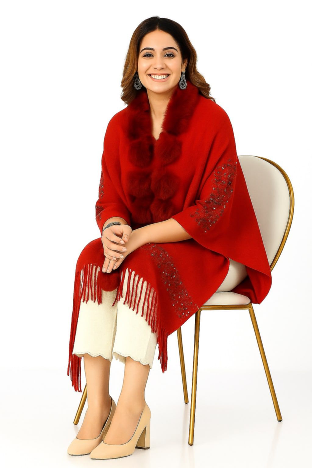 Be the first to review “Women’s Red Woolen Cape with Faux Fur Trim | Embroidered Winter Poncho with Tassel Hem | Elegant Warm Shawl Wrap”