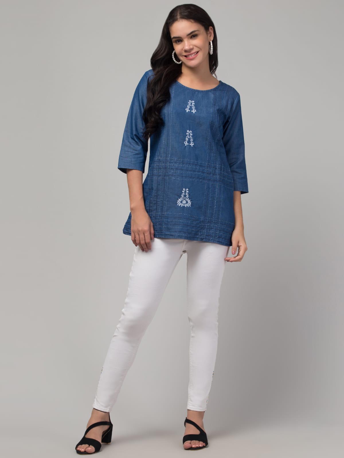 Be the first to review “Women’s Solid Denim Blue Tunic Top | Round Neck | Embroidered Detail | 3/4 Sleeves | Casual & Office Wear”