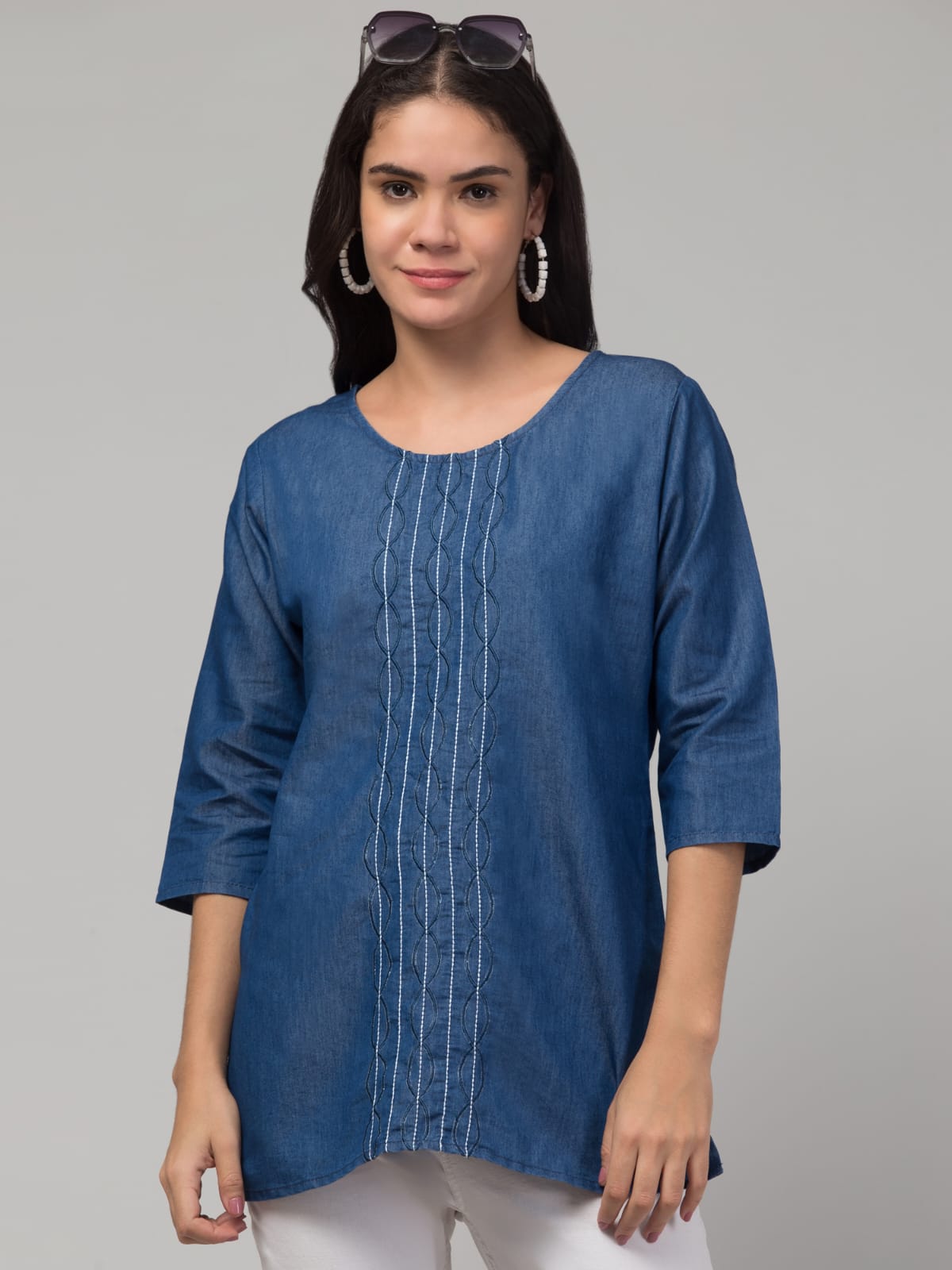 Women’s Solid Denim Blue Tunic Top | Round Neck | Front Stitch Detail | 3/4 Sleeves | Casual & Office Wear