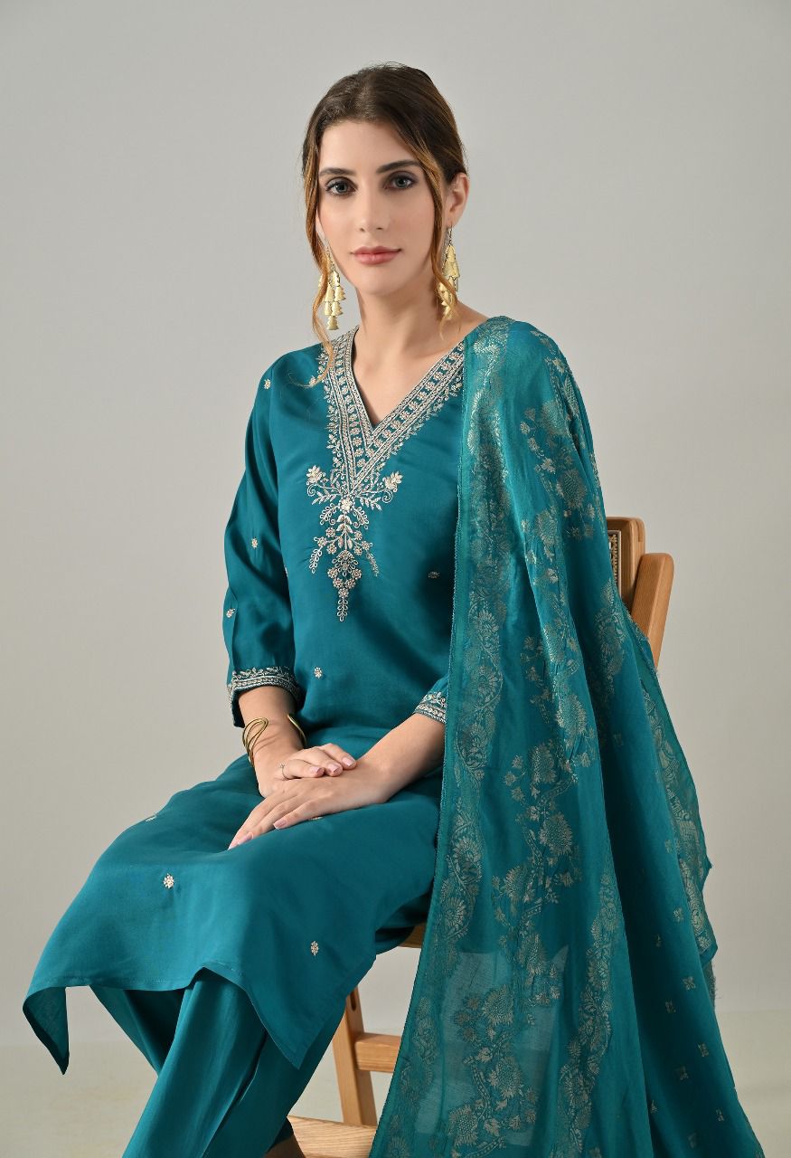 Women’s Teal Embroidered Kurta with Pants & Dupatta Set – Festive Ethnic Wear