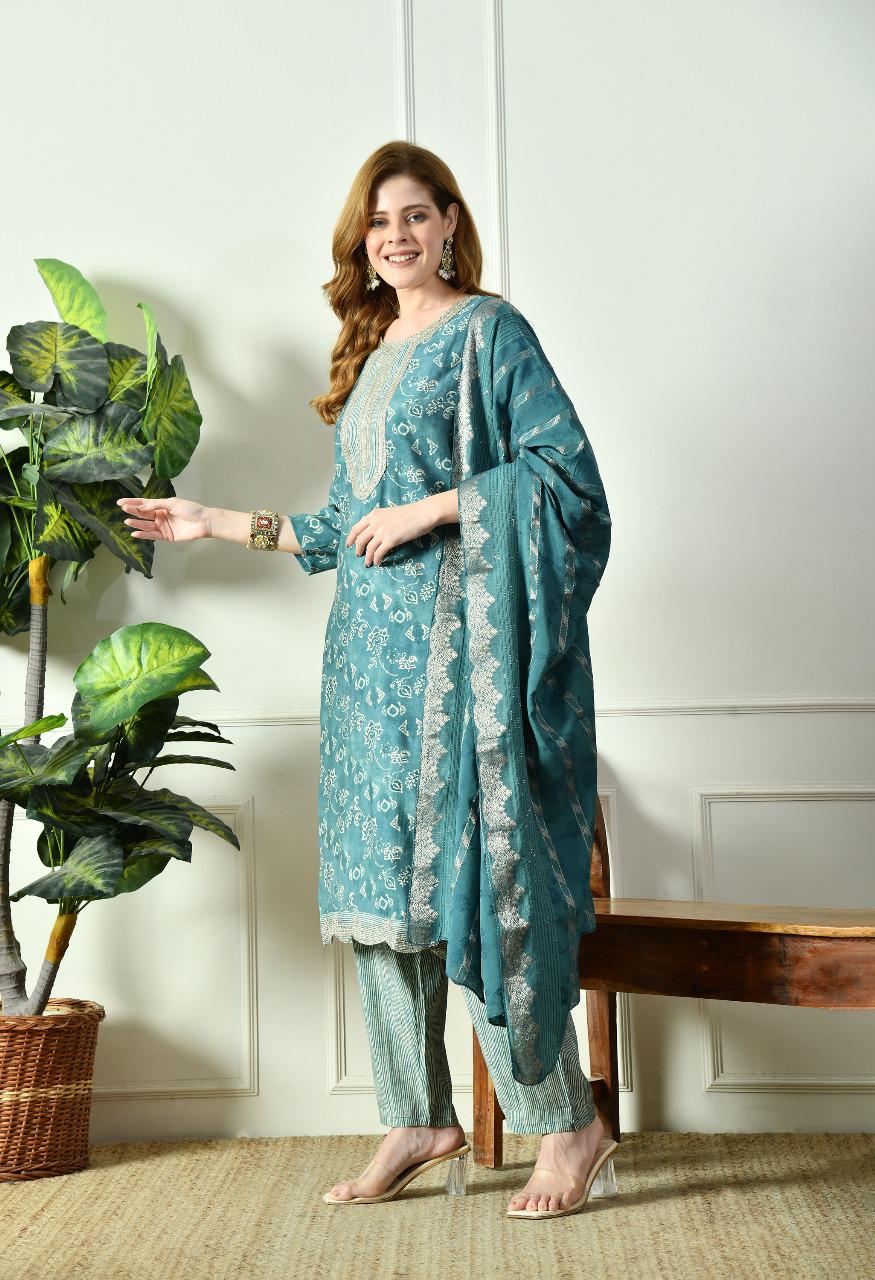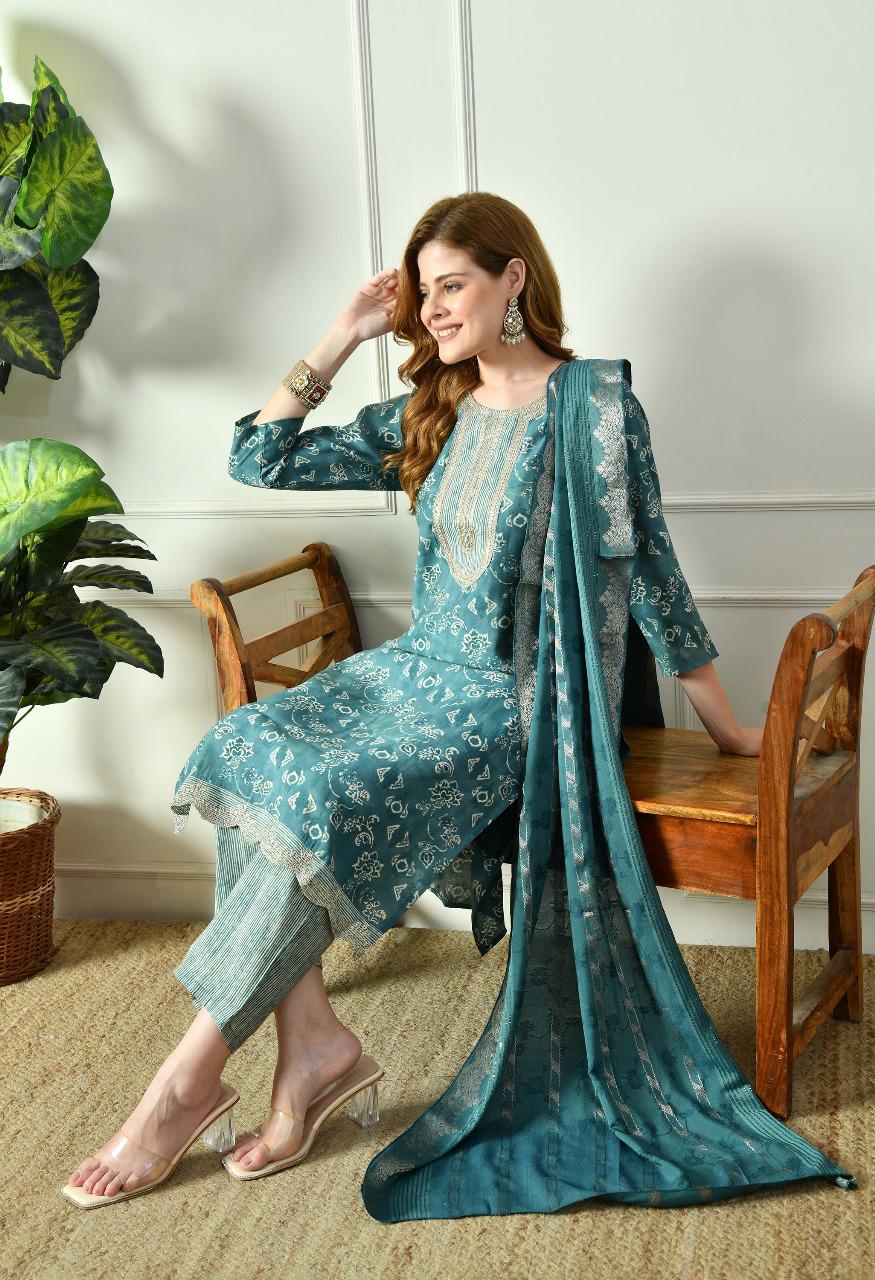 Women’s Teal Printed Kurta with Dupatta Set – Ethnic Festive Wear