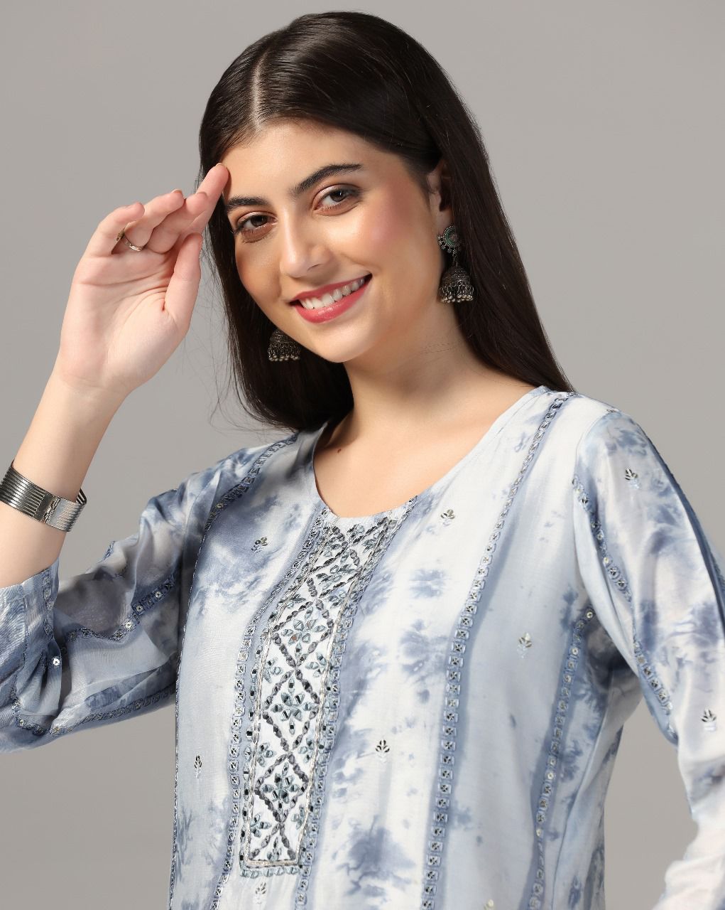 Trendy Tie-Dye Print – Stylish grey-blue printed kurta with subtle embroidery for a chic ethnic look.