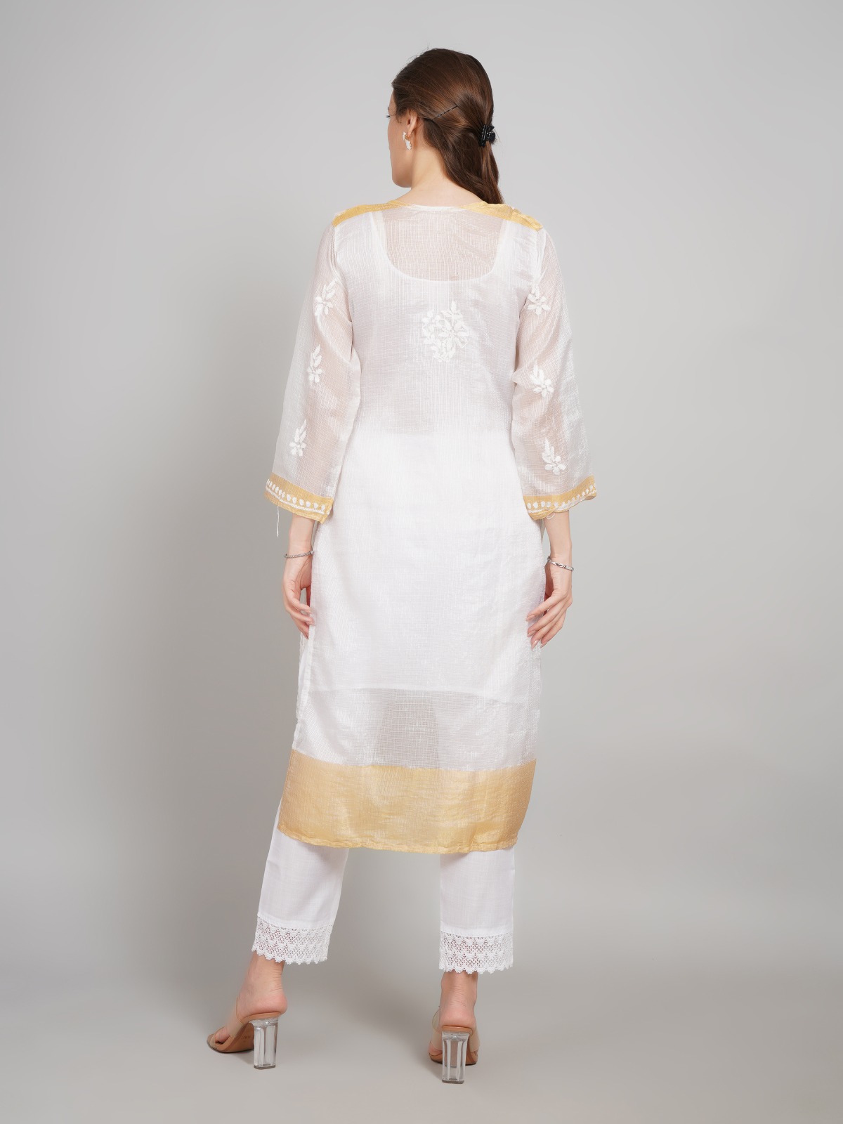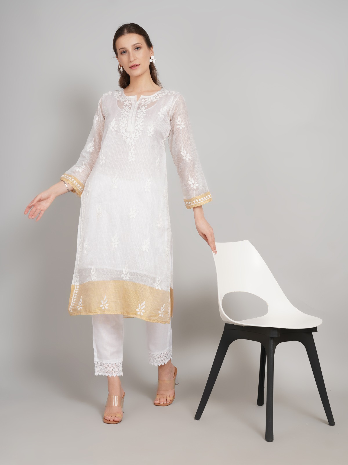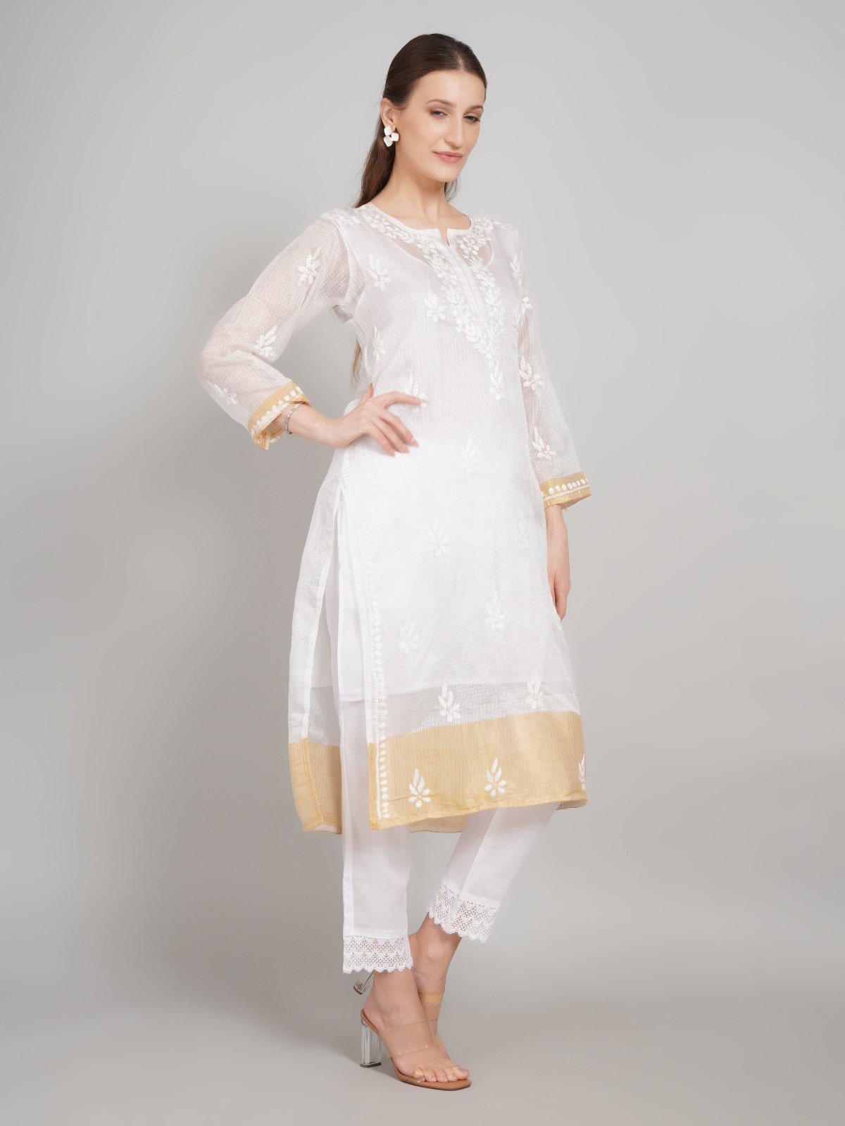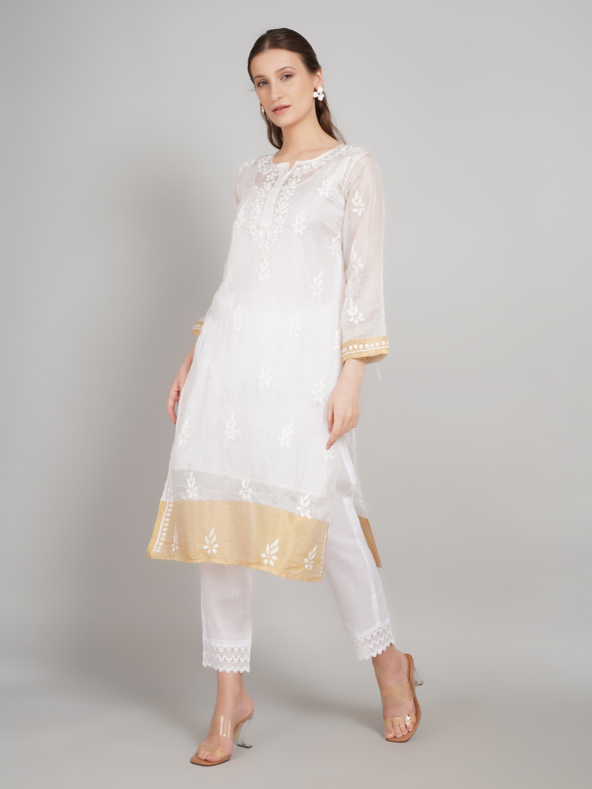 Women’s White Chanderi Cotton Chikankari Kurti with Inner | Hand Embroidered Straight Kurta | 3/4 Sleeve Ethnic Wear