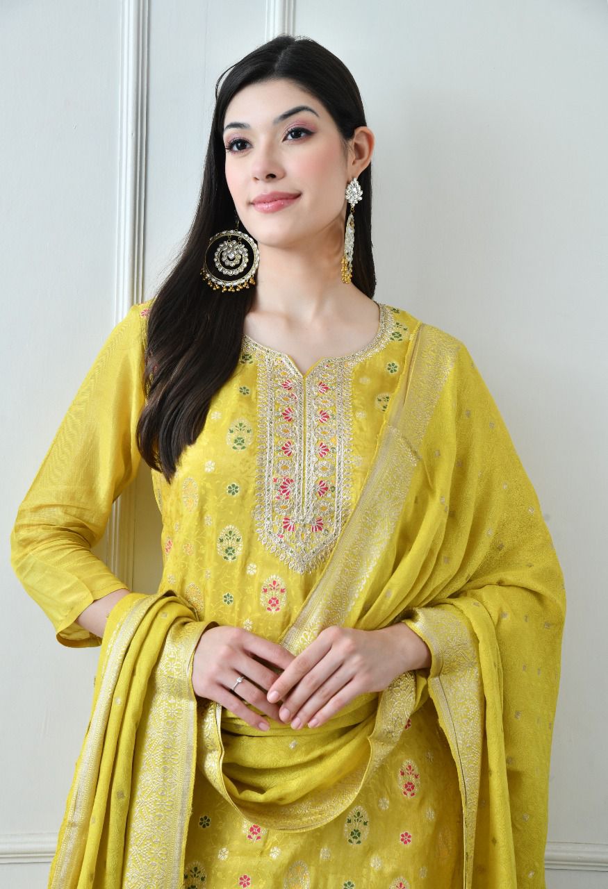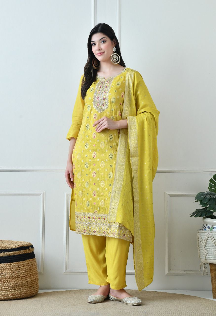 Women’s Yellow Embroidered Kurta with Pants & Dupatta Set – Festive Ethnic Wear